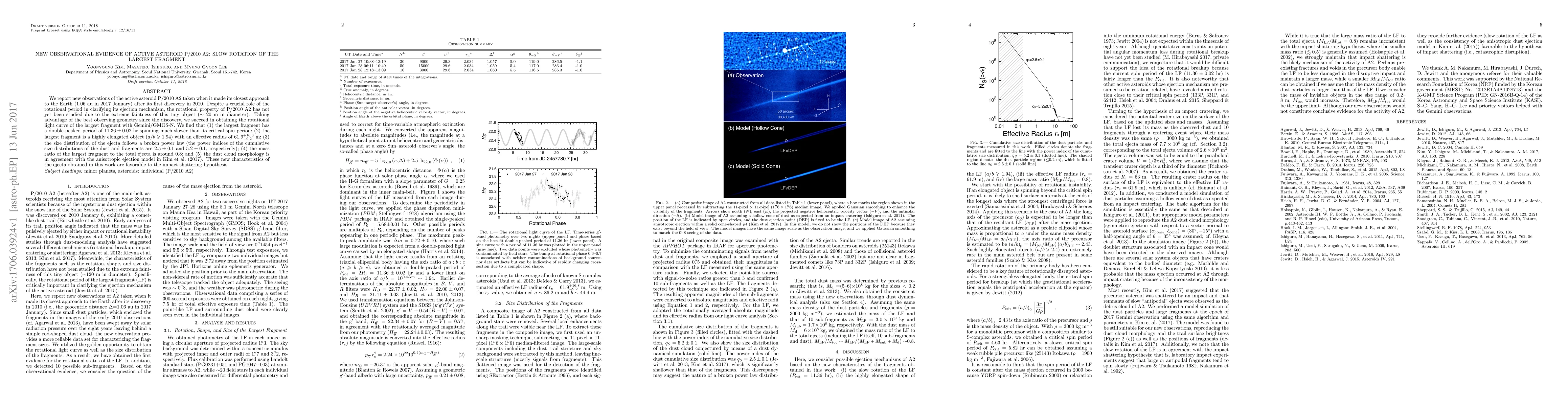 We report new observations of the active asteroid P/2010 A2 taken when it made its closest approach to the Earth (1.06 au in 2017 January) after its first discovery in 2010. Despite a crucial role of the rotational period in clarifying its ejection mechanism, the rotational property of P/2010 A2 has not yet been studied due to the extreme faintness of this tiny object ($\sim$120 m in diameter). Taking advantage of the best observing geometry since the discovery, we succeed in obtaining the rotational light curve of the largest fragment with Gemini/GMOS-N. We find that (1) the largest fragment has a double-peaked period of $11.36\pm0.02$ hr spinning much slower than its critical spin period; (2) the largest fragment is a highly elongated object ($a/b\geqslant 1.94$) with an effective radius of $61.9^{+16.8}_{-9.2}$ m; (3) the size distribution of the ejecta follows a broken power law (the power indices of the cumulative size distributions of the dust and fragments are $2.5\pm0.1$ and $5.2\pm0.1$, respectively); (4) the mass ratio of the largest fragment to the total ejecta is around 0.8; and (5) the dust cloud morphology is in agreement with the anisotropic ejection model in Kim et al. (2017). These new characteristics of the ejecta obtained in this work are favorable to the impact shattering hypothesis.
