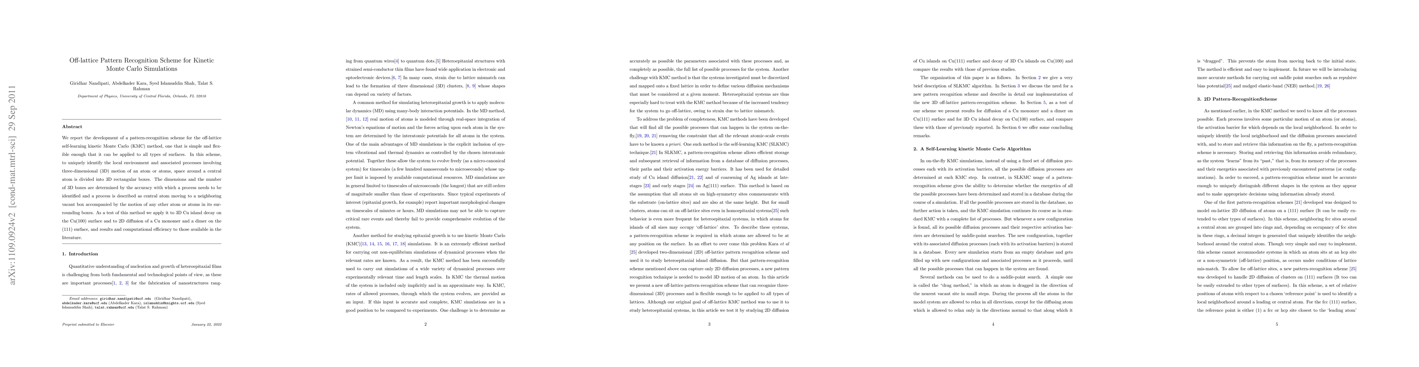This paper introduces a new pattern-recognition scheme for off-lattice kinetic Monte Carlo simulations, enabling the identification of local environments and processes involving three-dimensional atomic motion. The scheme applies to various surfaces and is tested on Cu island decay and Cu diffusion on Cu(100) and Cu(111) surfaces, showing improved computational efficiency compared to existing methods.
