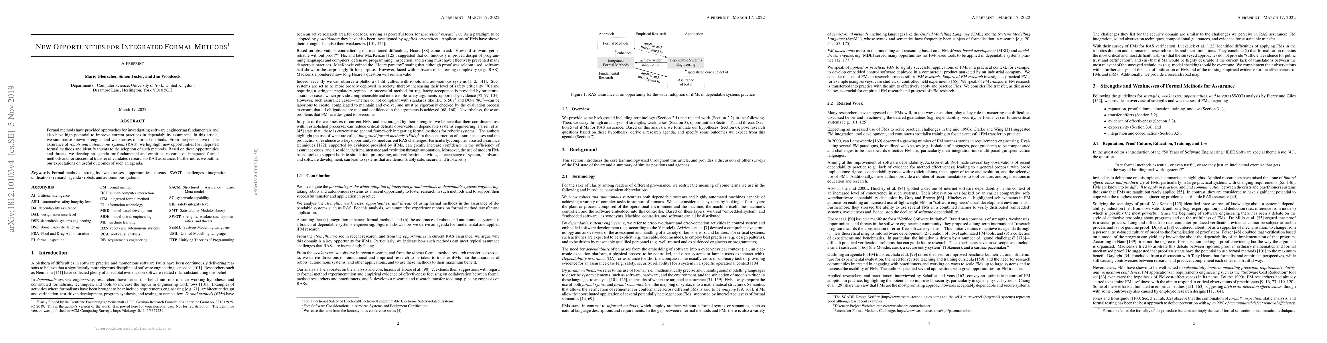 Formal methods have provided approaches for investigating software engineering fundamentals and also have high potential to improve current practices in dependability assurance. In this article, we summarise known strengths and weaknesses of formal methods. From the perspective of the assurance of robots and autonomous systems (RAS), we highlight new opportunities for integrated formal methods and identify threats to the adoption of such methods. Based on these opportunities and threats, we develop an agenda for fundamental and empirical research on integrated formal methods and for successful transfer of validated research to RAS assurance. Furthermore, we outline our expectations on useful outcomes of such an agenda.