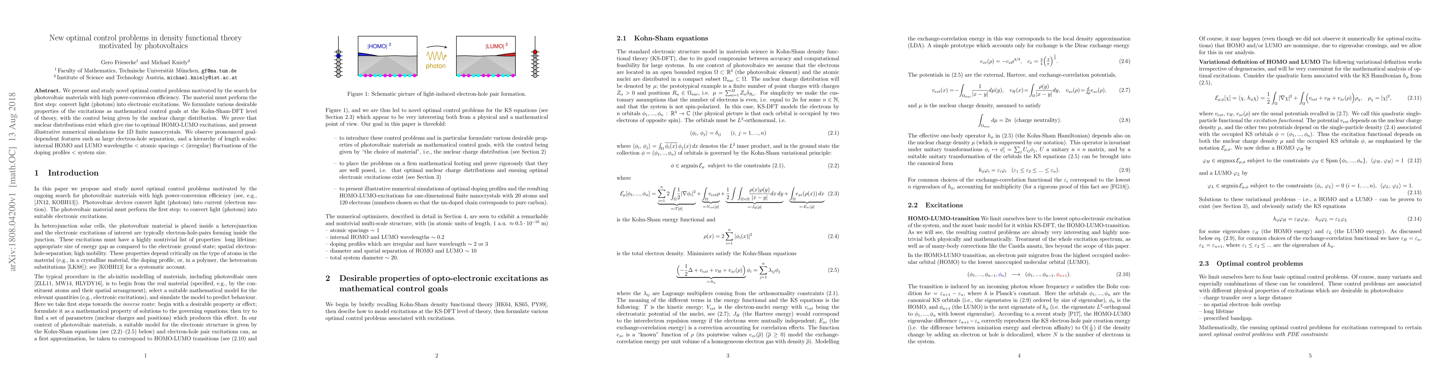 Researchers develop new optimal control problems to improve photovoltaic materials' efficiency, using density functional theory to optimize electronic excitations. They find that certain nuclear distributions can create optimal HOMO-LUMO excitations with distinct features like large electron-hole separation and varying length scales.