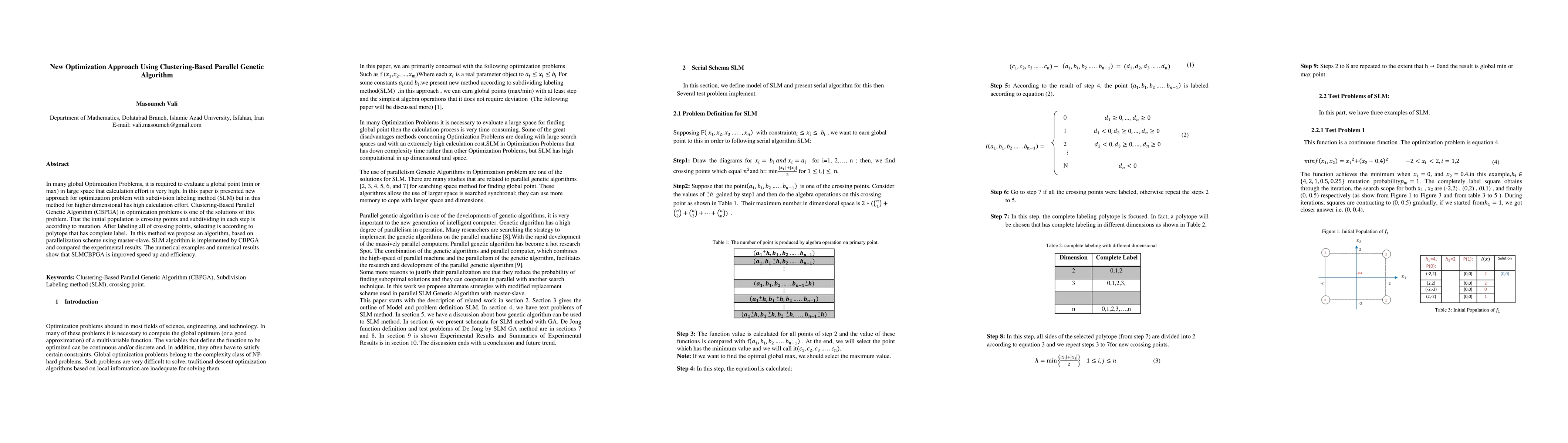 In many global Optimization Problems, it is required to evaluate a global point (min or max) in large space that calculation effort is very high. In this paper is presented new approach for optimization problem with subdivision labeling method (SLM) but in this method for higher dimensional has high calculation effort. Clustering-Based Parallel Genetic Algorithm (CBPGA) in optimization problems is one of the solutions of this problem. That the initial population is crossing points and subdividing in each step is according to mutation. After labeling all of crossing points, selecting is according to polytope that has complete label. In this method we propose an algorithm, based on parallelization scheme using master-slave. SLM algorithm is implemented by CBPGA and compared the experimental results. The numerical examples and numerical results show that SLMCBPGA is improved speed up and efficiency.