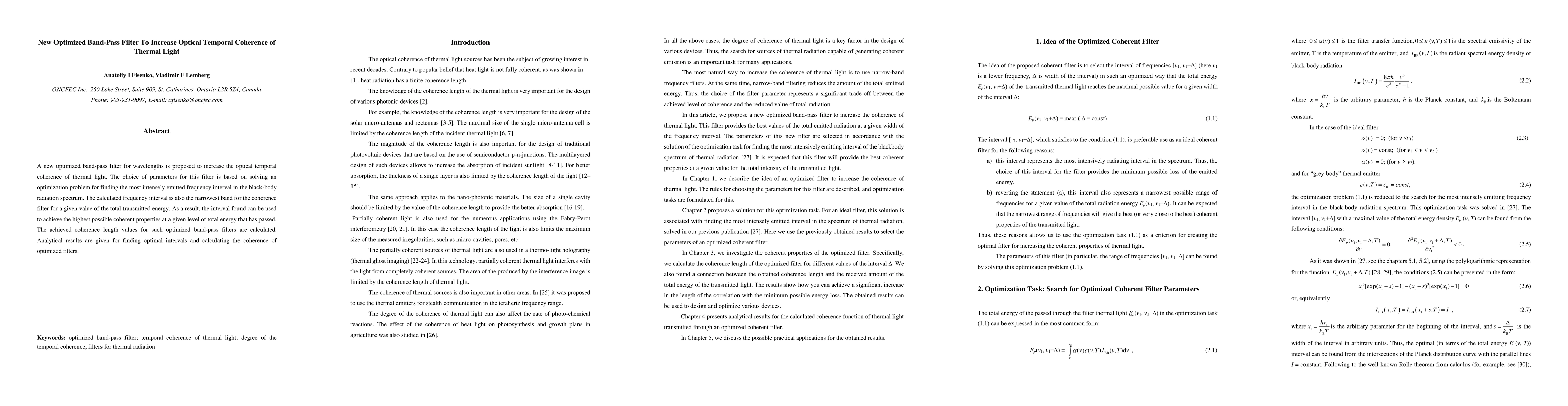 This paper proposes a new optimized band-pass filter to enhance the optical temporal coherence of thermal light by identifying the most intensely emitted frequency interval in the black-body radiation spectrum. The calculated interval maximizes coherence for a given total transmitted energy, achieving the highest possible coherent properties.