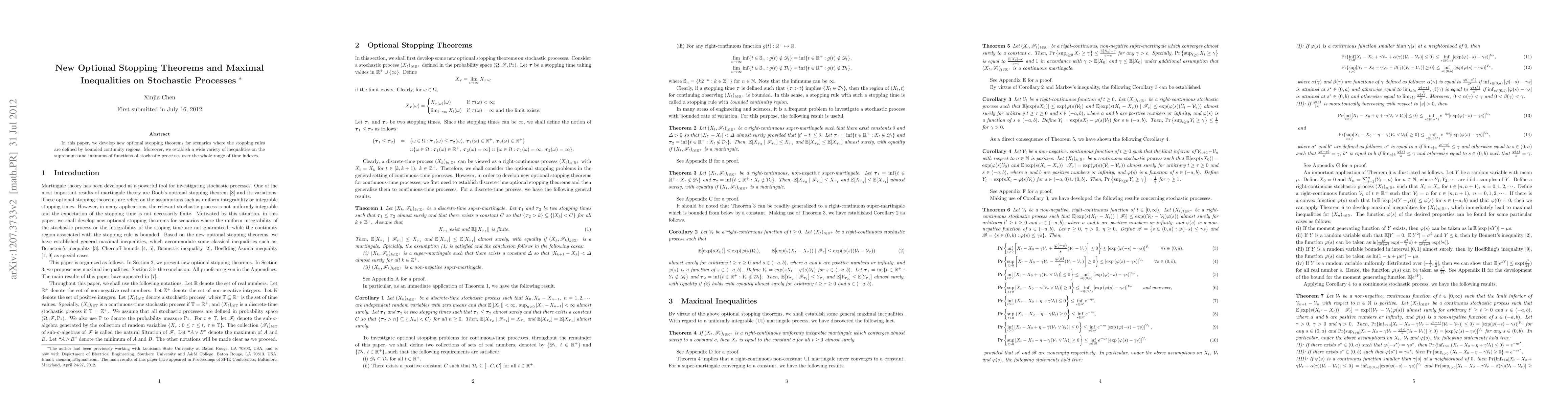 This paper introduces novel optional stopping theorems for stochastic processes with bounded continuity regions, and it also presents various inequalities concerning the supremums and infimums of stochastic processes across all time indexes.