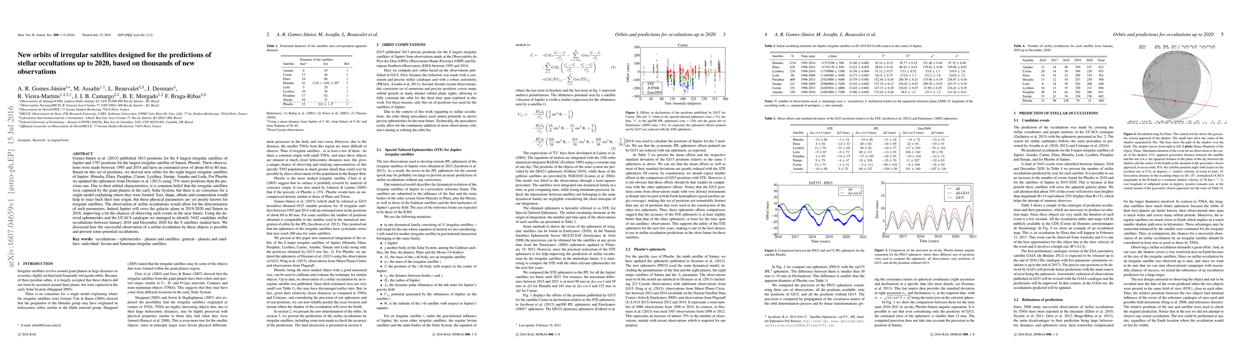 Gomes-Júnior et al. (2015) derived new orbits for Jupiter's eight largest irregular satellites and updated Phoebe's ephemeris using thousands of new observations. They identified 5442 potential stellar occultations for these satellites up to 2020, enhancing the prospects for determining their physical properties.
