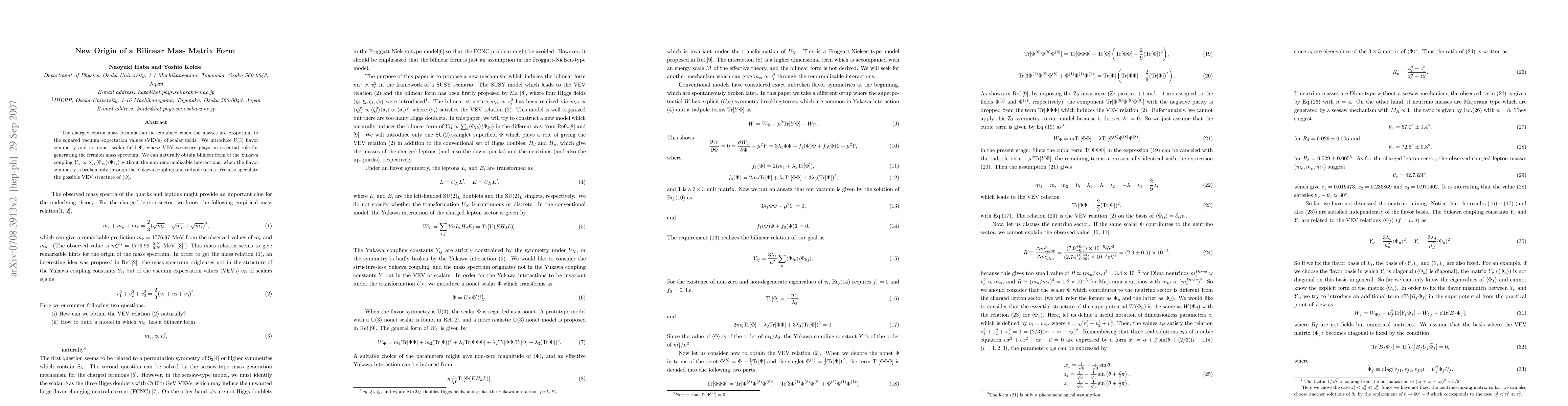 The charged lepton mass formula can be explained when the masses are propotinal to the squared vacuum expectation values (VEVs) of scalar fields. We introduce U(3) flavor symmetry and its nonet scalar field $\Phi$, whose VEV structure plays an essential role for generating the fermion mass spectrum. We can naturally obtain bilinear form of the Yukawa coupling $Y_{ij} \propto \sum_k <\Phi_{ik}> <\Phi_{kj}>$ without the non-renormalizable interactions, when the flavor symmetry is broken only through the Yukawa coupling and tadpole terms. We also speculate the possible VEV structure of $<\Phi>$.