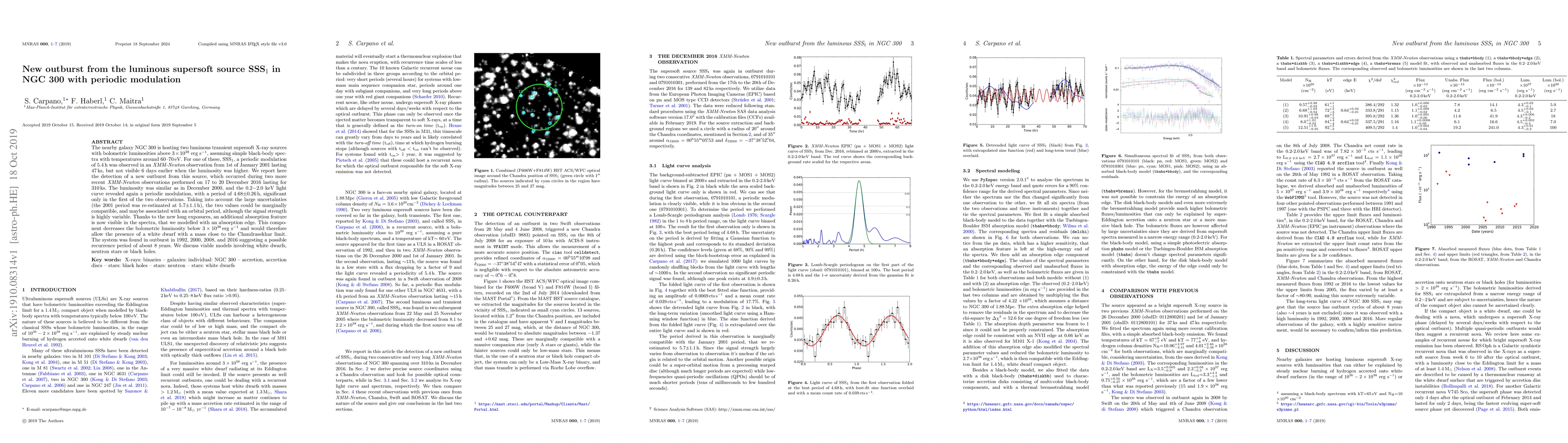 The research paper reports a new outburst from the supersoft X-ray source SSS1 in NGC 300, similar to the 2000 outburst. A periodic modulation of 4.68+-0.26h was detected, possibly linked to an orbital period, with an absorption feature suggesting a white dwarf close to the Chandrasekhar limit. The source has shown outbursts in 1992, 2000, 2008, and 2016, indicating a potential 8-year recurrence period. The paper discusses possible models involving white dwarfs, neutron stars, or black holes.