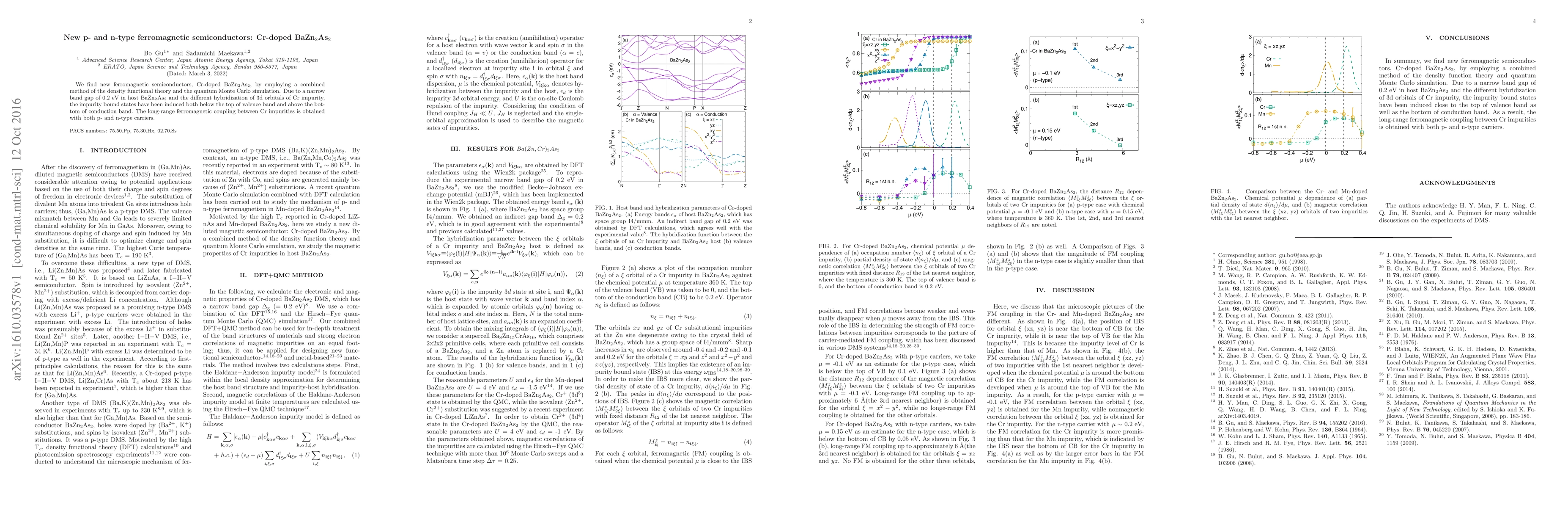 We find new ferromagnetic semiconductors, Cr-doped BaZn2As2, by employing a combined method of the density functional theory and the quantum Monte Carlo simulation. Due to a narrow band gap of 0.2 eV in host BaZn2As2 and the different hybridization of 3d orbitals of Cr impurity, the impurity bound states have been induced both below the top of valence band and above the bottom of conduction band. The long-range ferromagnetic coupling between Cr impurities is obtained with both p- and n-type carriers.