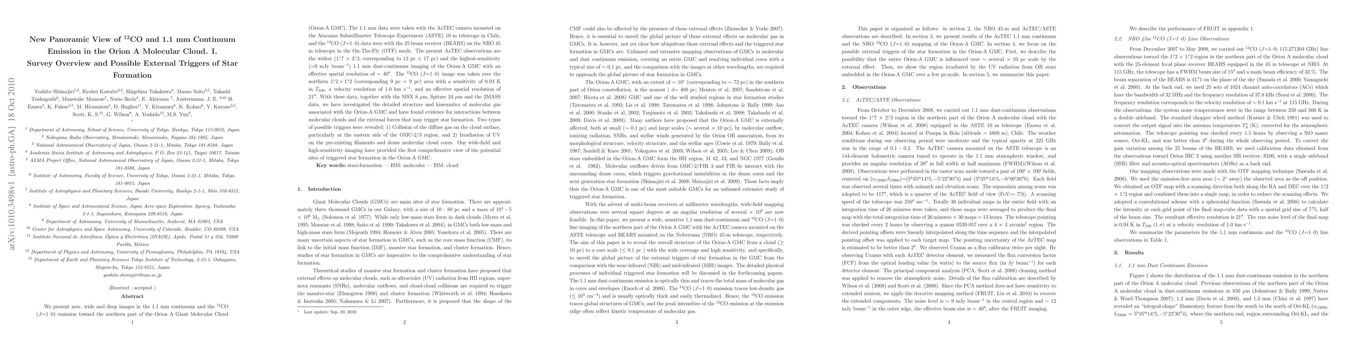 We present new, wide and deep images in the 1.1 mm continuum and the $^{12}$CO ($J$=1-0) emission toward the northern part of the Orion A Giant Molecular Cloud (Orion-A GMC). The 1.1 mm data were taken with the AzTEC camera mounted on the Atacama Submillimeter Telescope Experiment (ASTE) 10 m telescope in Chile, and the $^{12}$CO ($J$=1-0) data were with the 25 beam receiver (BEARS) on the NRO 45 m telescope in the On-The-Fly (OTF) mode. The present AzTEC observations are the widest $(\timeform{1.D7}$ $\times$ $\timeform{2.D3}$, corresponding to 12 pc $\times$ 17 pc) and the highest-sensitivity ($\sim$9 mJy beam$^{-1}$) 1.1 mm dust-continuum imaging of the Orion-A GMC with an effective spatial resolution of $\sim$ 40$\arcsec$. The $^{12}$CO ($J$=1-0) image was taken over the northern $\timeform{1D.2} \times\timeform{1D.2}$ (corresponding 9 pc $\times$ 9 pc) area with a sensitivity of 0.93 K in $T_{\rm MB}$, a velocity resolution of 1.0 km s$^{-1}$, and an effective spatial resolution of 21$\arcsec$. With these data, together with the MSX 8 $\mu$m, Spitzer 24 $\mu$m and the 2MASS data, we have investigated the detailed structure and kinematics of molecular gas associated with the Orion-A GMC and have found evidence for interactions between molecular clouds and the external forces that may trigger star formation. Two types of possible triggers were revealed; 1) Collision of the diffuse gas on the cloud surface, particularly at the eastern side of the OMC-2/3 region, and 2) Irradiation of UV on the pre-existing filaments and dense molecular cloud cores. Our wide-field and high-sensitivity imaging have provided the first comprehensive view of the potential sites of triggered star formation in the Orion-A GMC.
