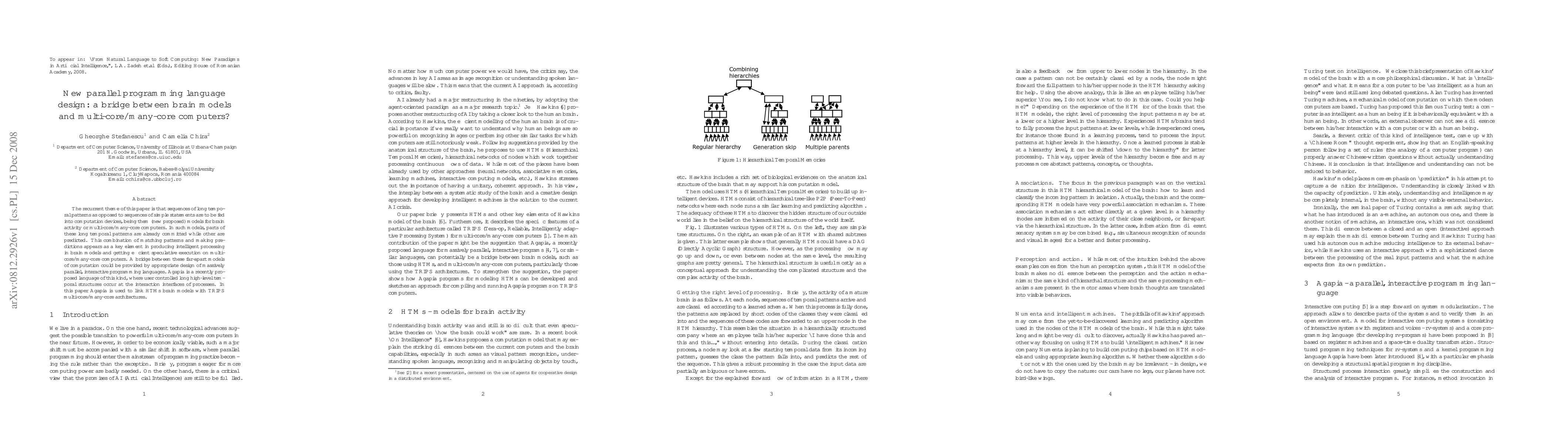 This paper proposes Agapia, a new parallel programming language designed to bridge brain models and multi-core/many-core computers by utilizing long temporal patterns for computation. It aims to facilitate efficient speculative execution and intelligent processing through matching patterns and predictions.