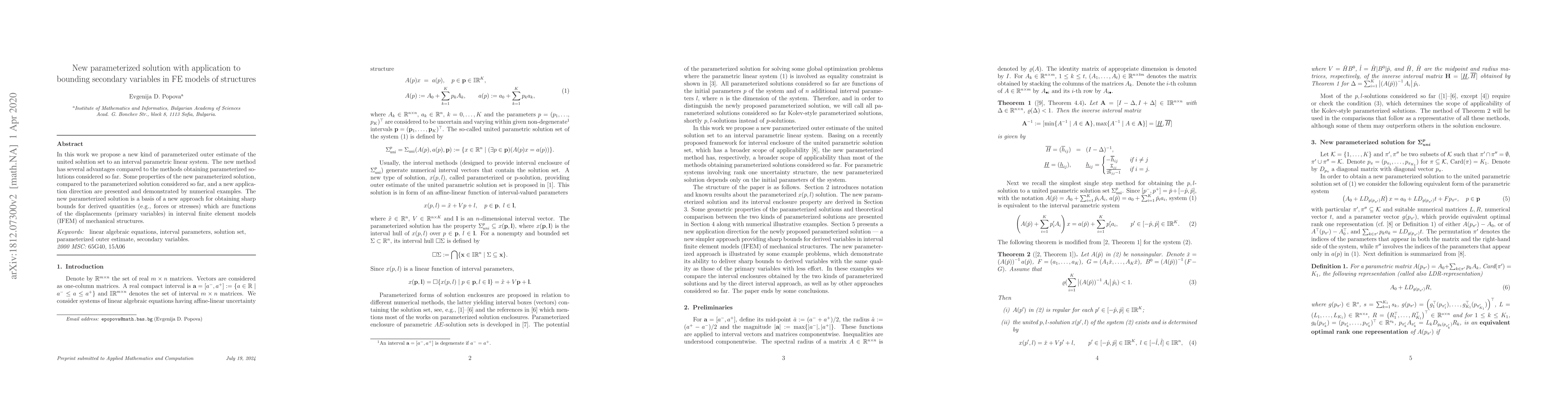 In this work we propose a new kind of parameterized outer estimate of the united solution set to an interval parametric linear system. The new method has several advantages compared to the methods obtaining parameterized solutions considered so far. Some properties of the new parameterized solution, compared to the parameterized solution considered so far, and a new application direction are presented and demonstrated by numerical examples. The new parameterized solution is a basis of a new approach for obtaining sharp bounds for derived quantities (e.g., forces or stresses) which are functions of the displacements (primary variables) in interval finite element models of mechanical structures.