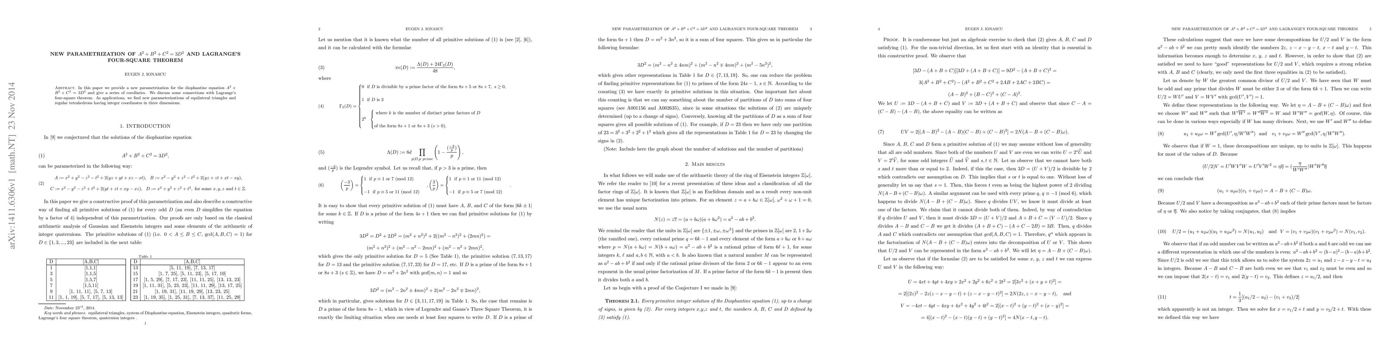 This paper introduces a novel parametrization for the Diophantine equation $A^2+B^2+C^2=3D^2$ and explores its implications, drawing connections to Lagrange's four-square theorem. It also derives new parameterizations for equilateral triangles and regular tetrahedrons with integer coordinates in three dimensions.
