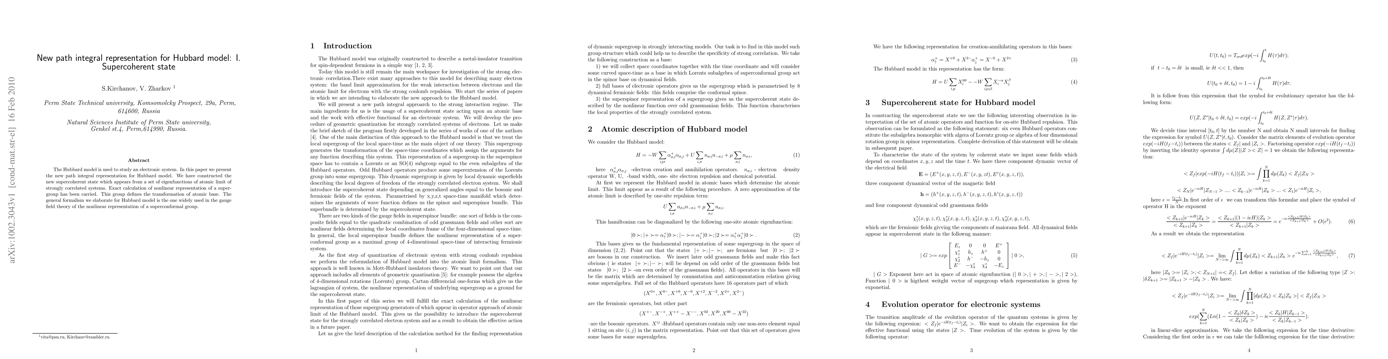 This paper introduces a new path integral representation for the Hubbard model, constructing a supercoherent state derived from eigenfunctions of the atomic limit. The exact calculation of the nonlinear representation of a supergroup is performed, defining the transformation of the atomic basis, and employing a formalism similar to gauge field theory.
