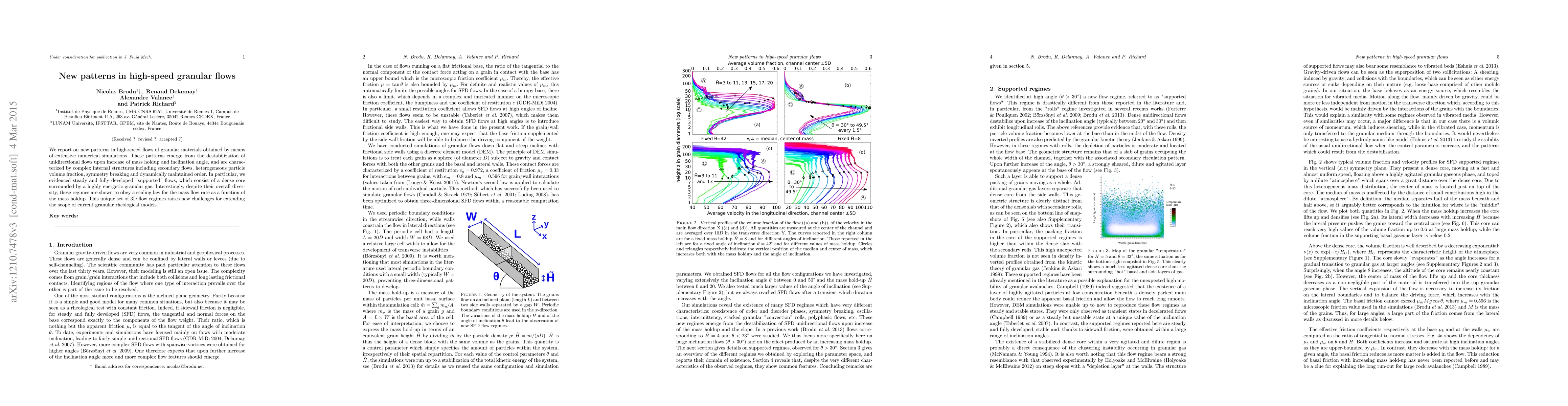 This paper reports on new patterns in high-speed granular flows discovered through extensive numerical simulations, including complex internal structures and steady "supported" flows characterized by a dense core and energetic granular gas. These regimes follow a scaling law for mass flow rate, challenging existing granular rheological models.