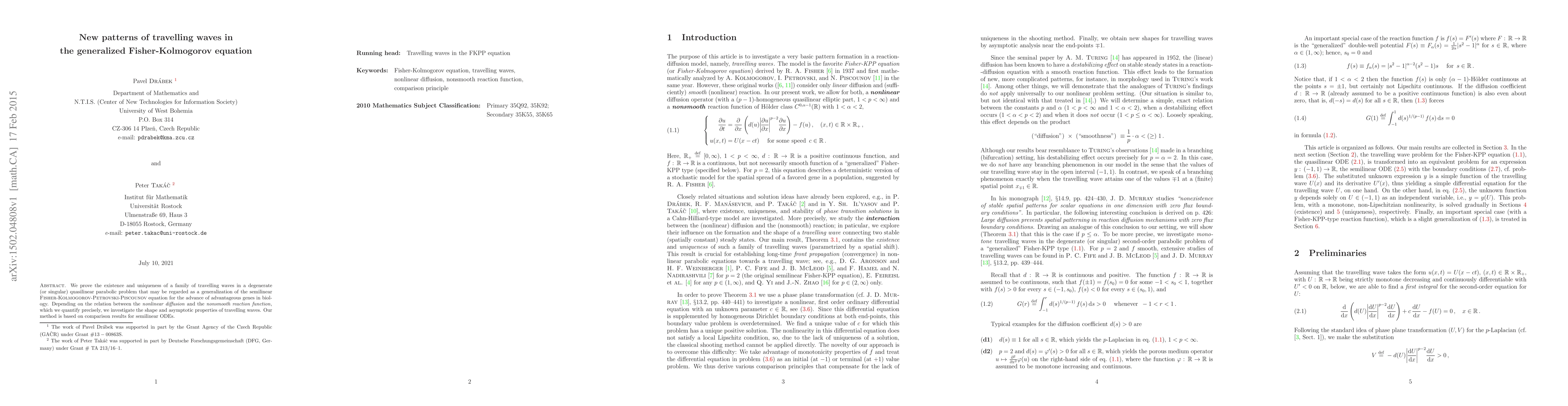 The paper proves the existence of traveling waves in a generalized Fisher-Kolmogorov equation, showing how their shape depends on the balance between nonlinear diffusion and reaction function.