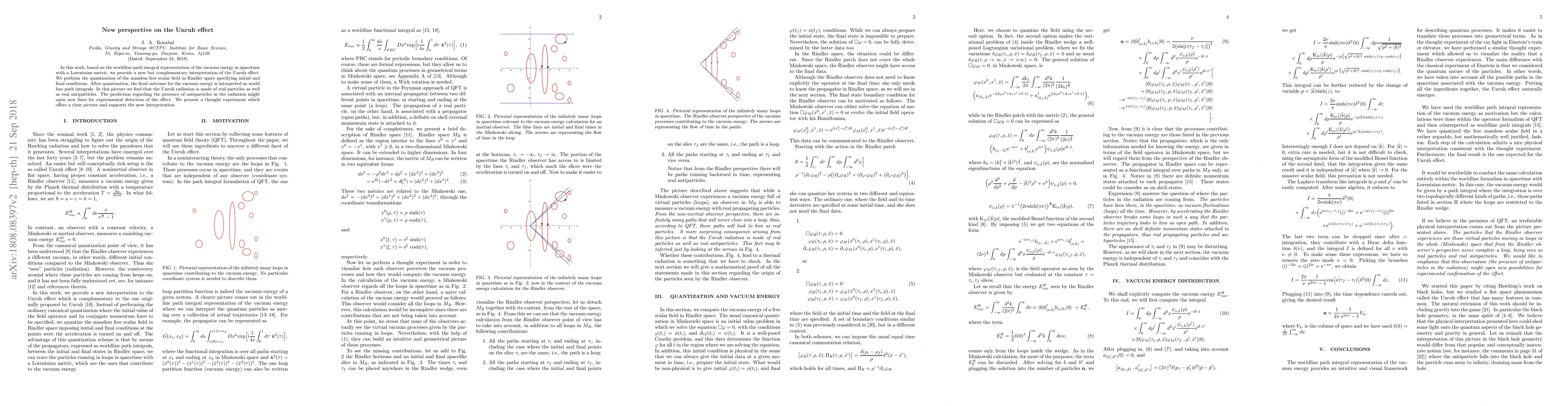 In this work, based on the worldline path integral representation of the vacuum energy in spacetime with a Lorentzian metric, we provide a new but complementary interpretation of the Unruh effect. We perform the quantization of the massless free scalar field in Rindler space specifying initial and final conditions. After quantization, the final outcome for the vacuum energy is interpreted as world line path integrals. In this picture we find that the Unruh radiation is made of real particles as well as real antiparticles. The prediction regarding the presence of antiparticles in the radiation might open new lines for experimental detection of the effect. We present a thought experiment which offers a clear picture and supports the new interpretation.