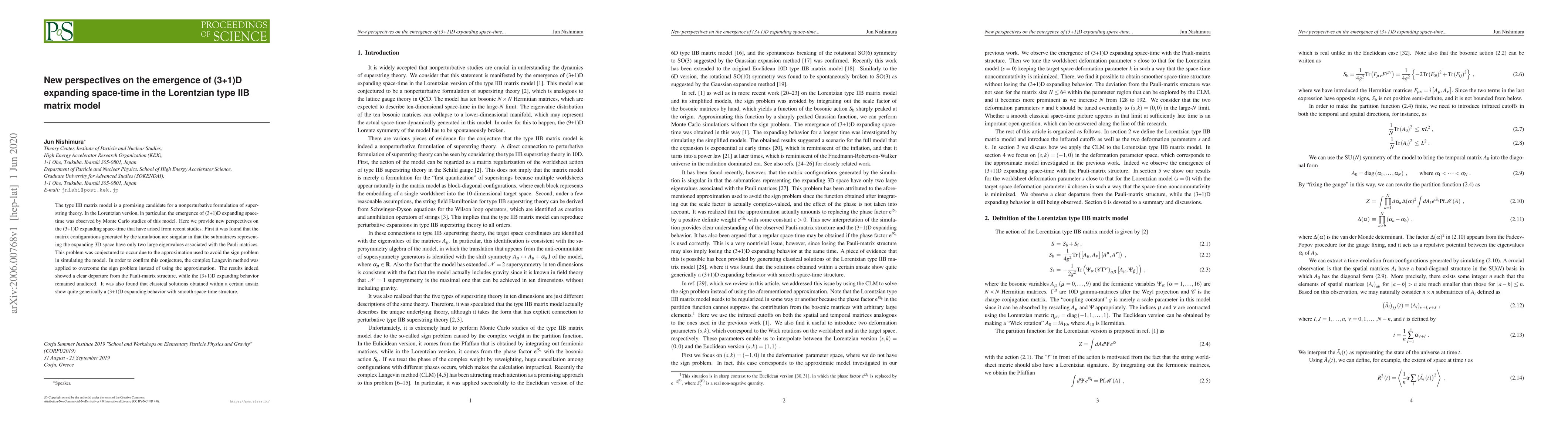 The type IIB matrix model is a promising candidate for a nonperturbative formulation of superstring theory. In the Lorentzian version, in particular, the emergence of (3+1)D expanding space-time was observed by Monte Carlo studies of this model. Here we provide new perspectives on the (3+1)D expanding space-time that have arised from recent studies. First it was found that the matrix configurations generated by the simulation are singular in that the submatrices representing the expanding 3D space have only two large eigenvalues associated with the Pauli matrices. This problem was conjectured to occur due to the approximation used to avoid the sign problem in simulating the model. In order to confirm this conjecture, the complex Langevin method was applied to overcome the sign problem instead of using the approximation. The results indeed showed a clear departure from the Pauli-matrix structure, while the (3+1)D expanding behavior remained unaltered. It was also found that classical solutions obtained within a certain ansatz show quite generically a (3+1)D expanding behavior with smooth space-time structure.