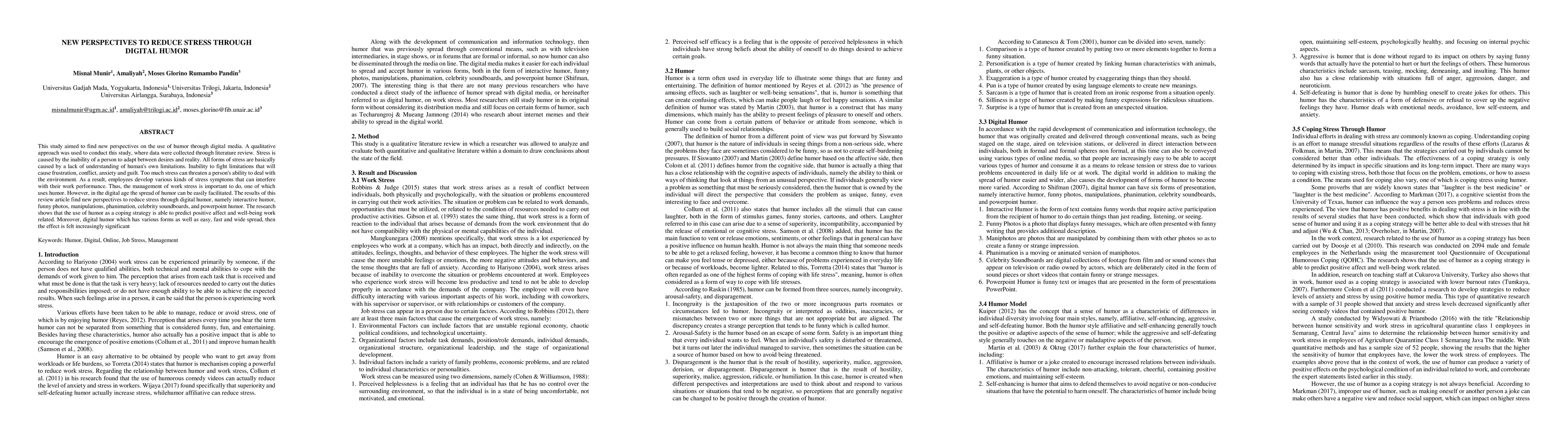 This study aimed to find new perspectives on the use of humor through digital media. A qualitative approach was used to conduct this study, where data were collected through a literature review. Stress is caused by the inability of a person to adapt between desires and reality. All forms of stress are basically caused by a lack of understanding of human's own limitations. Inability to fight limitations that will cause frustration, conflict, anxiety, and guilt. Too much stress can threaten a person's ability to deal with the environment. As a result, employees develop various kinds of stress symptoms that can interfere with their work performance. Thus, the management of work stress is important to do, one of which uses humor. However, in the digital age, the spread of humor can be easily facilitated. The results of this review article find new perspectives to reduce stress through digital humor, namely interactive humor, funny photos, manipulations, phanimation, celebrity soundboards, and PowerPoint humor. The research shows that the use of humor as a coping strategy is able to predict positive affect and well-being work-related. Moreover, digital humor which has various forms as well as easy, fast, and wide spread, then the effect is felt increasingly significant
