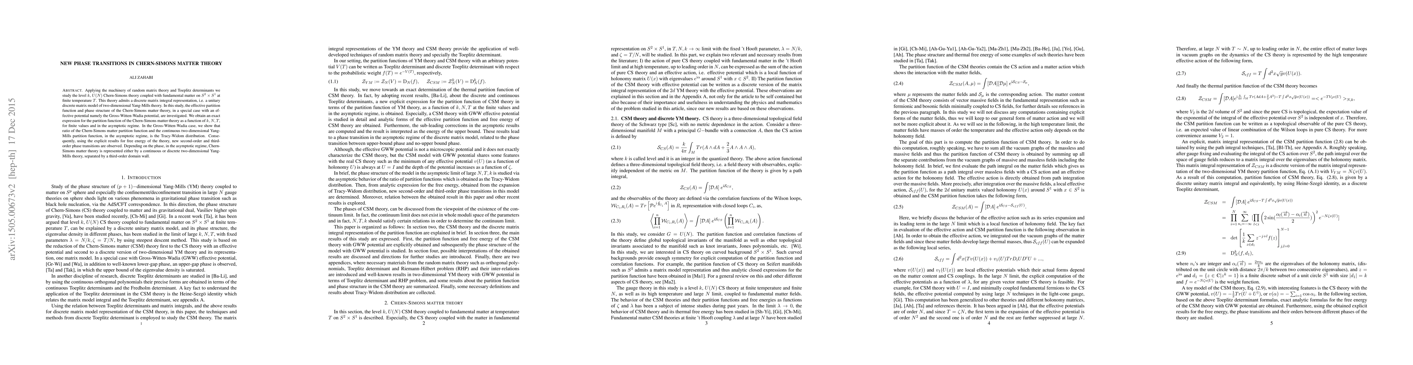 Applying the machinery of random matrix theory and Toeplitz determinants we study the level $k$, $U(N)$ Chern-Simons theory coupled with fundamental matter on $S^2\times S^1$ at finite temperature $T$. This theory admits a discrete matrix integral representation, i.e. a unitary discrete matrix model of two-dimensional Yang-Mills theory. In this study, the effective partition function and phase structure of the Chern-Simons matter theory, in a special case with an effective potential namely the Gross-Witten-Wadia potential, are investigated. We obtain an exact expression for the partition function of the Chern-Simons matter theory as a function of $k,N,T,$ for finite values and in the asymptotic regime. In the Gross-Witten-Wadia case, we show that ratio of the Chern-Simons matter partition function and the continuous two-dimensional Yang-Mills partition function, in the asymptotic regime, is the Tracy-Widom distribution. Consequently, using the explicit results for free energy of the theory, new second-order and third-order phase transitions are observed. Depending on the phase, in the asymptotic regime, Chern-Simons matter theory is represented either by a continuous or discrete two-dimensional Yang-Mills theory, separated by a third-order domain wall.