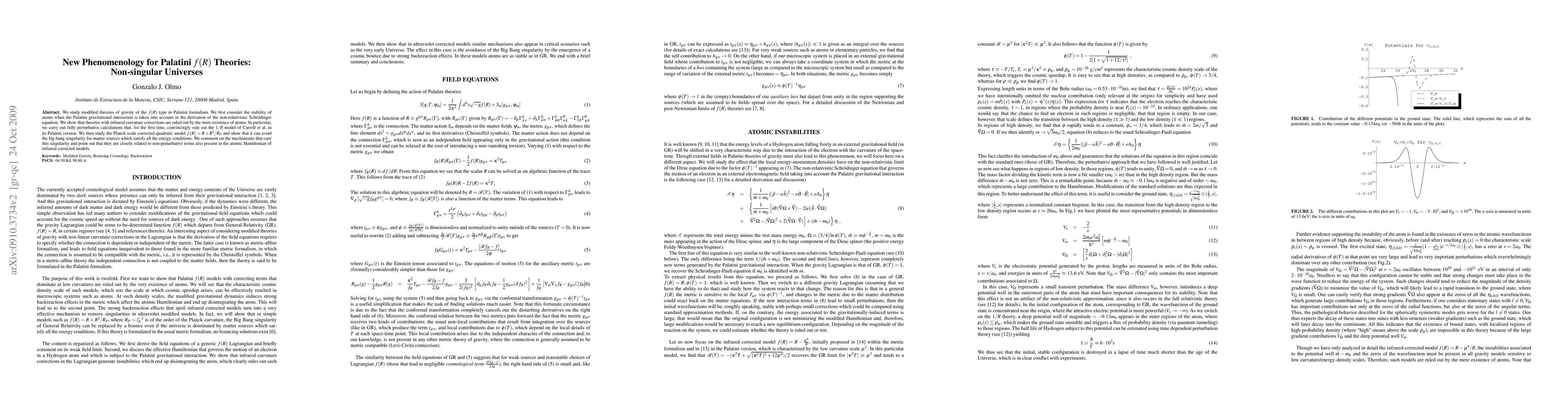 We study modified theories of gravity of the f(R) type in Palatini formalism. We first consider the stability of atoms when the Palatini gravitational interaction is taken into account in the derivation of the non-relativistic Schrodinger equation. We show that theories with infrared curvature corrections are ruled out by the mere existence of atoms. In particular, we carry out fully perturbative calculations that, for the first time, convincingly rule out the 1/R model of Carroll et al. in its Palatini version. We then study the Planck scale corrected quadratic model f(R)=R+R^2/R_P and show that it can avoid the big bang singularity for matter sources which satisfy all the energy conditions. We comment on the mechanisms that cure this singularity and point out that they are closely related to non-perturbative terms also present in the atomic Hamiltonian of infrared corrected models.