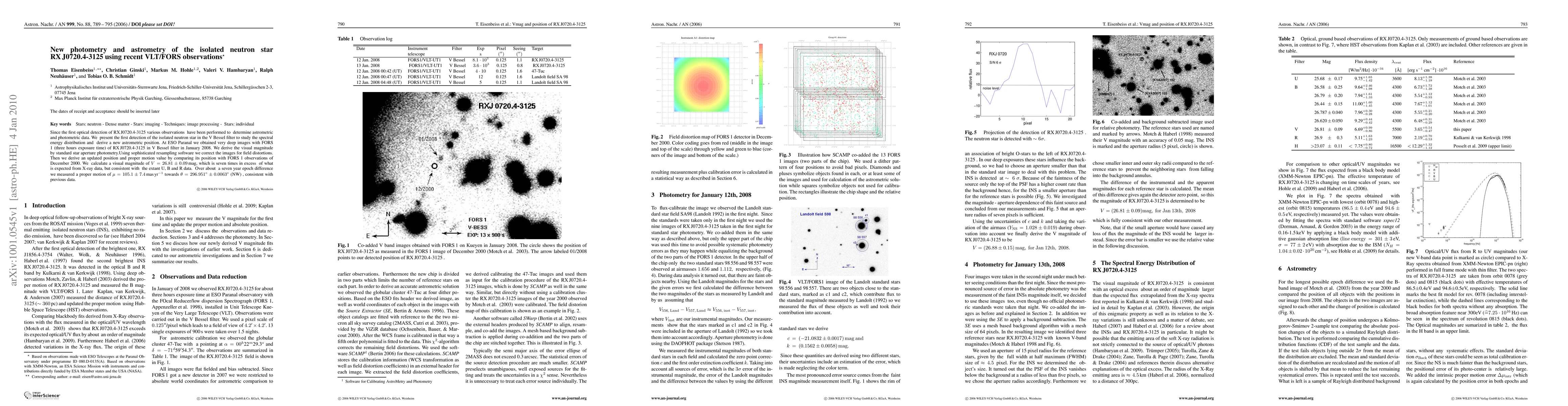 Since the first optical detection of RXJ0720.4-3125 various observations have been performed to determine astrometric and photometric data. We present the first detection of the isolated neutron star in the V Bessel filter to study the spectral energy distribution and derive a new astrometric position. At ESO Paranal we obtained very deep images with FORS 1 (three hours exposure time) of RXJ0720.4-3125 in V Bessel filter in January 2008. We derive the visual magnitude by standard star aperture photometry.Using sophisticated resampling software we correct the images for field distortions. Then we derive an updated position and proper motion value by comparing its position with FORS 1 observations of December 2000. We calculate a visual magnitude of V = 26.81 +- 0.09mag, which is seven times in excess of what is expected from X-ray data, but consistent with the extant U, B and R data. Over about a seven year epoch difference we measured a proper motion of mu = 105.1 +- 7.4mas/yr towards theta = 296.951 deg +- 0.0063 deg (NW), consistent with previous data.