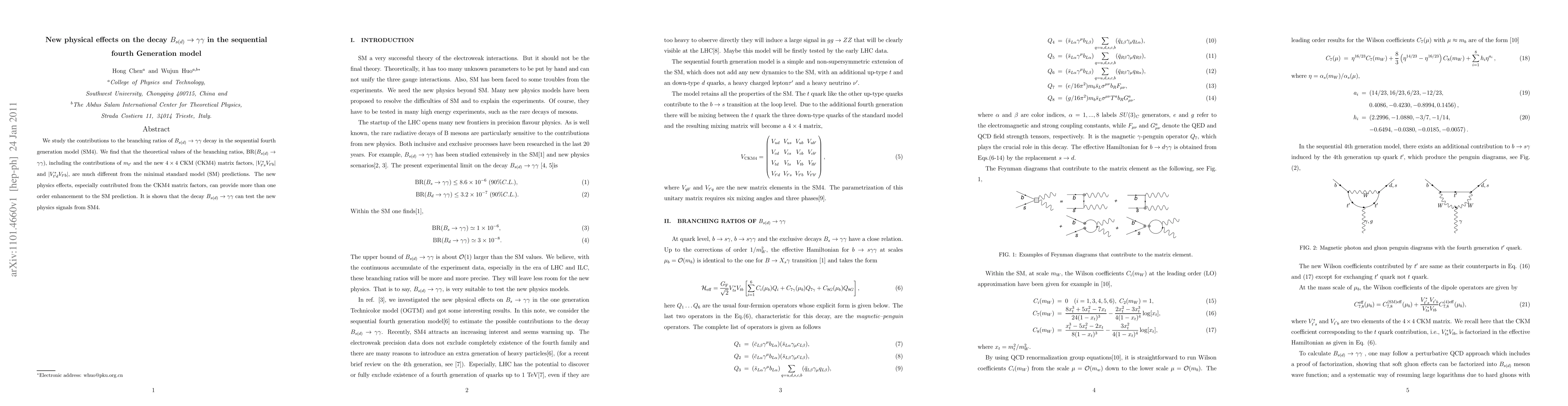 This paper investigates the decay processes $B_{s(d)} \to \gamma\gamma$ within the sequential fourth generation model (SM4), revealing significant deviations from minimal standard model predictions due to new physics effects, particularly from the $4 \times 4$ CKM matrix factors. These effects can enhance the branching ratios by more than an order of magnitude, making the decay a potential probe for new physics signals from SM4.