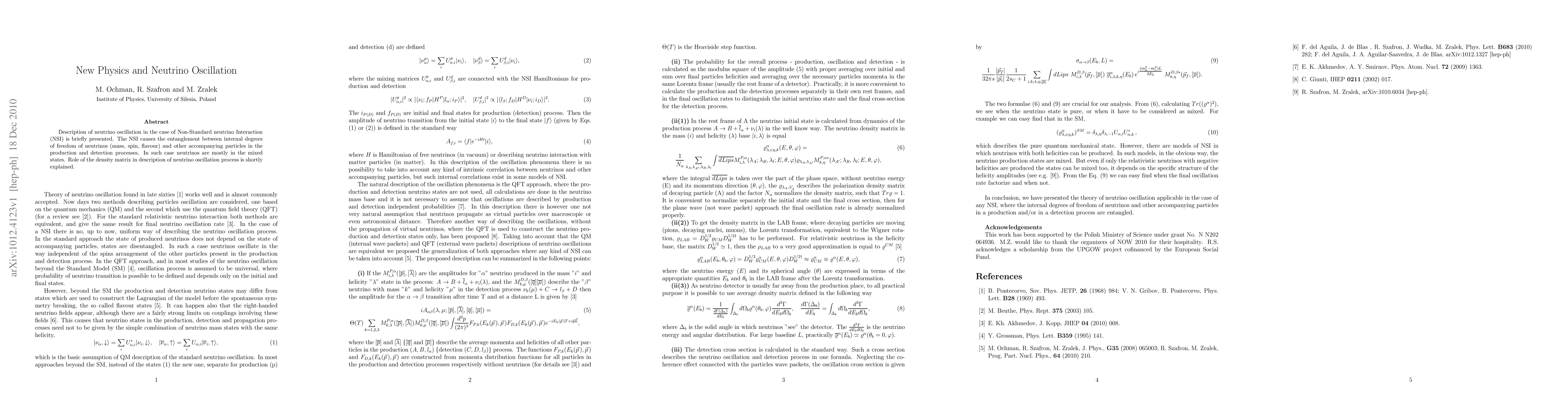 Research explores neutrino oscillation in Non-Standard neutrino Interaction (NSI), where neutrinos are entangled with accompanying particles, leading to mostly mixed states. The paper highlights the role of density matrices in describing this process.