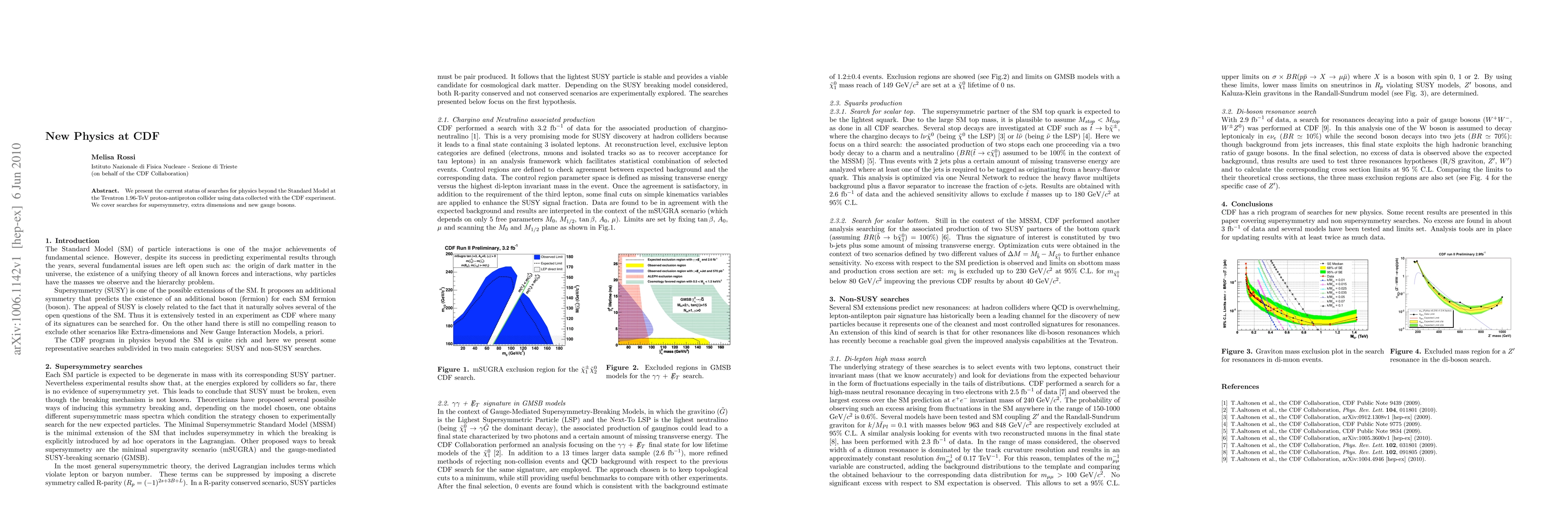 Summary: This paper reviews the CDF experiment's findings on searches for physics beyond the Standard Model at the Tevatron collider, focusing on supersymmetry, extra dimensions, and new gauge bosons. No significant discoveries are reported in these areas.