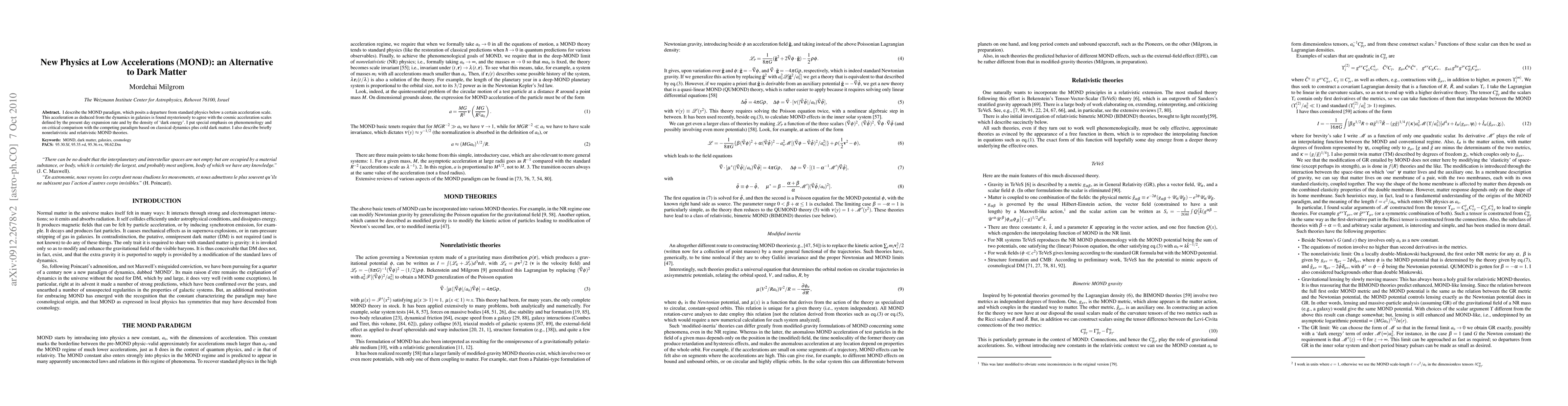Summary: The paper explores Modified Newtonian Dynamics (MOND) as an alternative to dark matter, suggesting a fundamental departure from standard physics at low accelerations. It highlights the surprising alignment of galactic dynamics with cosmic acceleration scales and contrasts MOND with the cold dark matter paradigm.