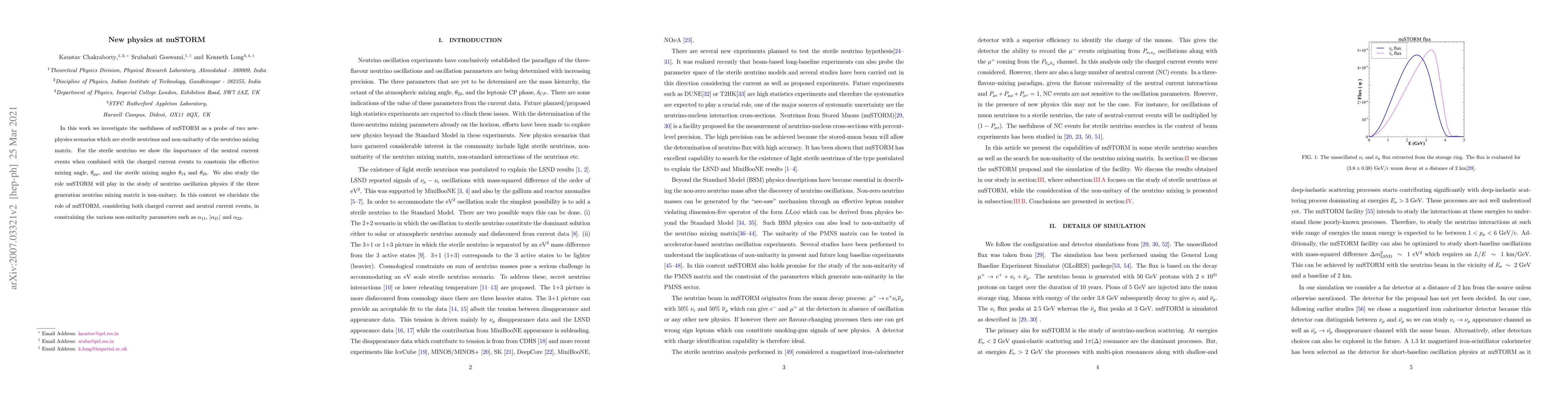 In this work we investigate the usefulness of nuSTORM as a probe of two new-physics scenarios which are sterile neutrinos and non-unitarity of the neutrino mixing matrix. For the sterile neutrino we show the importance of the neutral current events when combined with the charged current events to constrain the effective mixing angle, $\theta_{\mu \mu}$, and the sterile mixing angles $\theta_{14}$ and $\theta_{24}$. We also study the role nuSTORM will play in the study of neutrino oscillation physics if the three generation neutrino mixing matrix is non-unitary. In this context we elucidate the role of nuSTORM, considering both charged current and neutral current events, in constraining the various non-unitarity parameters such as $\alpha_{11}$, $|\alpha_{21}|$ and $\alpha_{22}$.