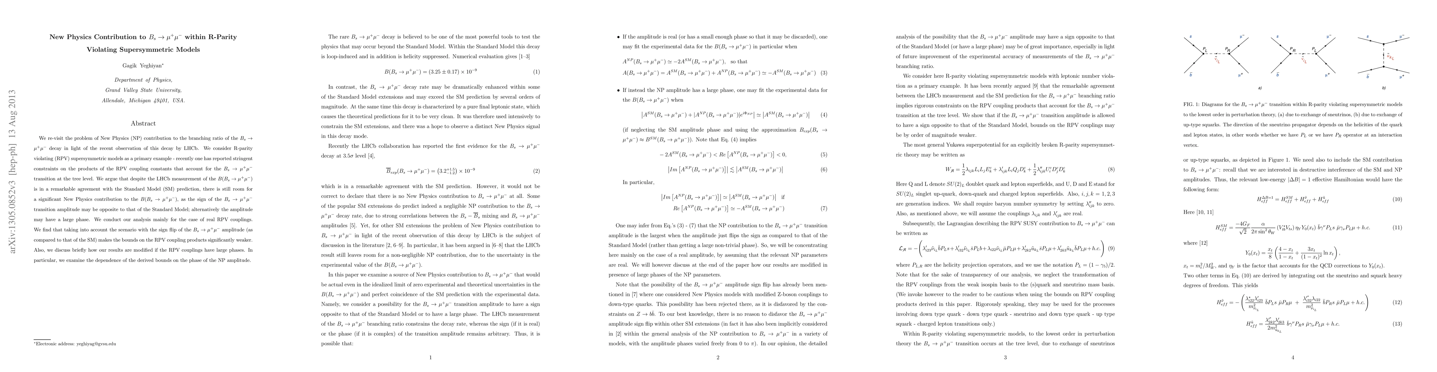 We re-visit the problem of New Physics (NP) contribution to the branching ratio of the $B_s \to \mu^+ \mu^-$ decay in light of the recent observation of this decay by LHCb. We consider R-parity violating (RPV) supersymmetric models as a primary example - recently one has reported stringent constraints on the products of the RPV coupling constants that account for the $B_s \to \mu^+ \mu^-$ transition at the tree level. We argue that despite the LHCb measurement of the $B(B_s \to \mu^+ \mu^-)$ is in a remarkable agreement with the Standard Model (SM) prediction, there is still room for a significant New Physics contribution to the $B(B_s \to \mu^+ \mu^-)$, as the sign of the $B_s \to \mu^+ \mu^-$ transition amplitude may be opposite to that of the Standard Model; alternatively the amplitude may have a large phase. We conduct our analysis mainly for the case of real RPV couplings. We find that taking into account the scenario with the sign flip of the $B_s \to \mu^+ \mu^-$ amplitude (as compared to that of the SM) makes the bounds on the RPV coupling products significantly weaker. Also, we discuss briefly how our results are modified if the RPV couplings have large phases. In particular, we examine the dependence of the derived bounds on the phase of the NP amplitude.
