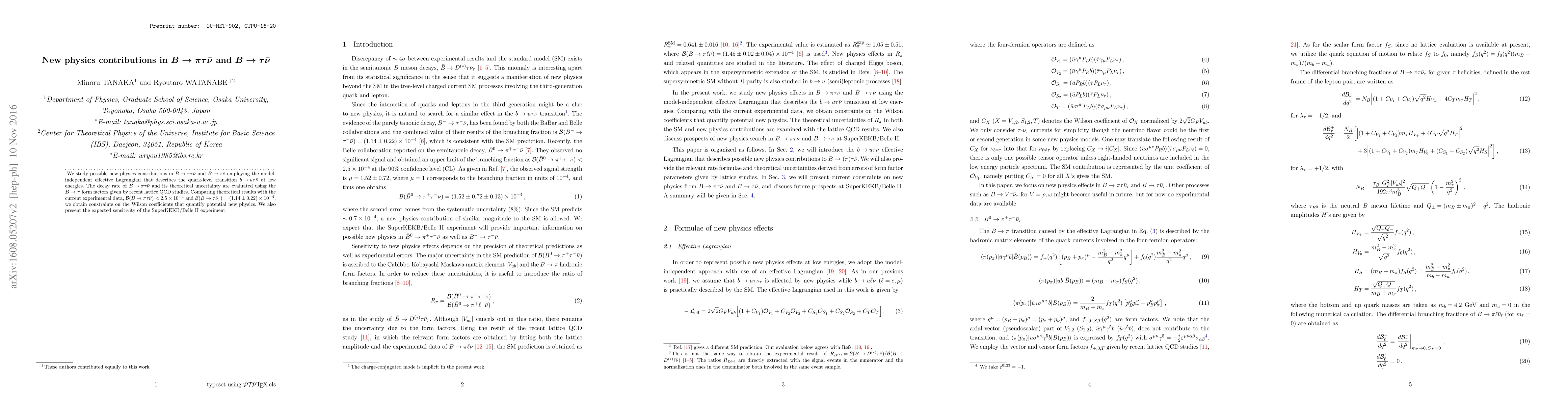 This paper investigates new physics contributions in $B\to\pi\tau\bar\nu$ and $B\to\tau\bar\nu$ decays using an effective Lagrangian approach. It evaluates decay rates and uncertainties, comparing results with experimental data to constrain Wilson coefficients and anticipates future sensitivity from the SuperKEKB/Belle II experiment.