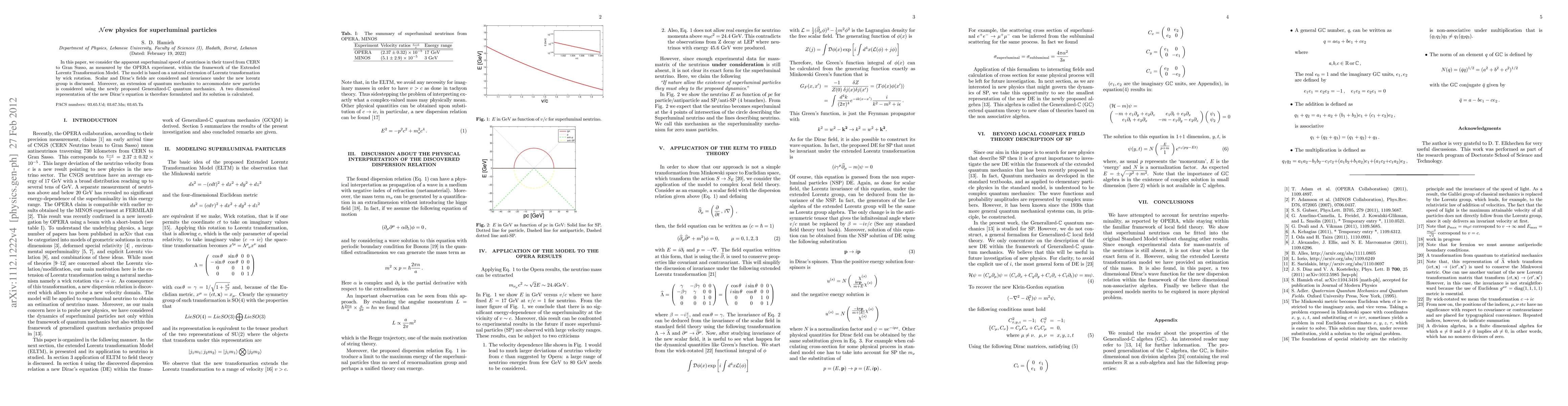 In this paper, we consider the apparent superluminal speed of neutrinos in their travel from CERN to Gran Susso, as measured by the OPERA experiment, within the framework of the Extended Lorentz Transformation Model. The model is based on a natural extension of Lorentz transformation by wick rotation. Scalar and Dirac's fields are considered and invariance under the new lorentz group is discussed. Moreover, an extension of quantum mechanics to accommodate new particles is considered using the newly proposed Generalized-$\mathbb{C}$ quantum mechanics. A two dimensional representation of the new Dirac's equation is therefore formulated and its solution is calculated.