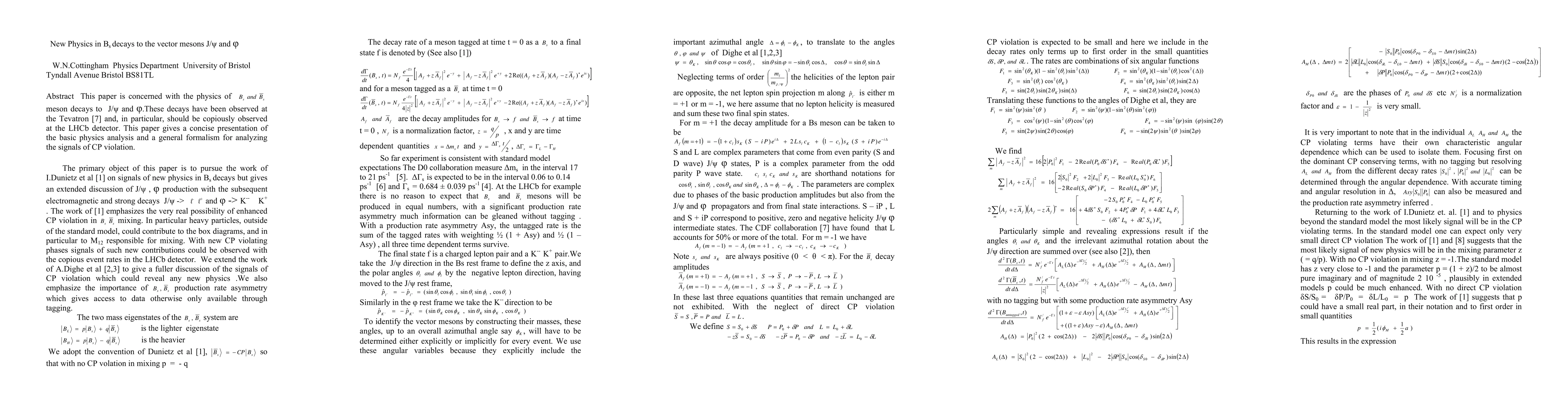 This paper is concerned with the physics of meson decays to J/psi and phi.These decays have been observed at the Tevatron [7] and, in particular, should be copiously observed at the LHCb detector. This paper gives a concise presentation of the basic physics analysis and a general formalism for analyzing the signals of CP violation.