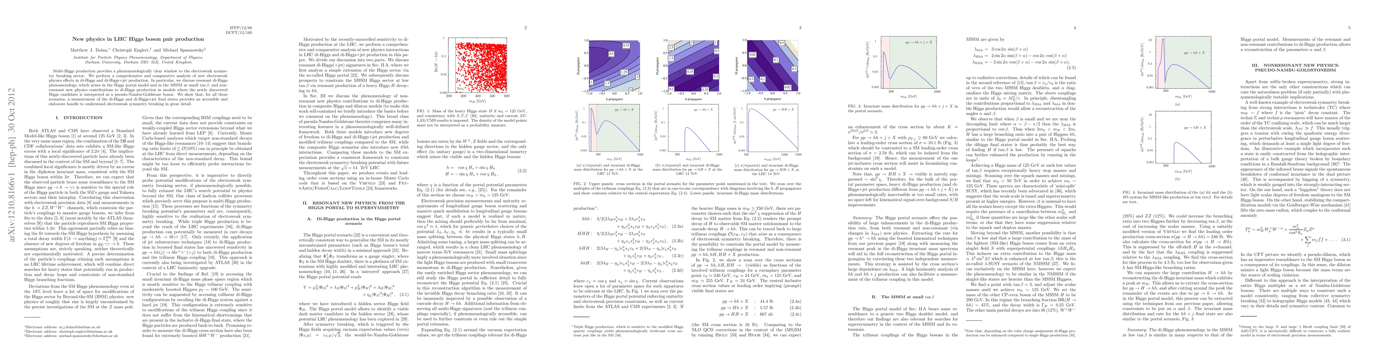 Multi-Higgs production provides a phenomenologically clear window to the electroweak symmetry breaking sector. We perform a comprehensive and comparative analysis of new electroweak physics effects in di-Higgs and di-Higgs+jet production. In particular, we discuss resonant di-Higgs phenomenology, which arises in the Higgs portal model and in the MSSM at small tan beta, and non-resonant new physics contributions to di-Higgs production in models where the newly discovered Higgs candidate is interpreted as a pseudo-Nambu-Goldstone boson. We show that, for all these scenarios, a measurement of the di-Higgs and di-Higgs+jet final states provides an accessible and elaborate handle to understand electroweak symmetry breaking in great detail.