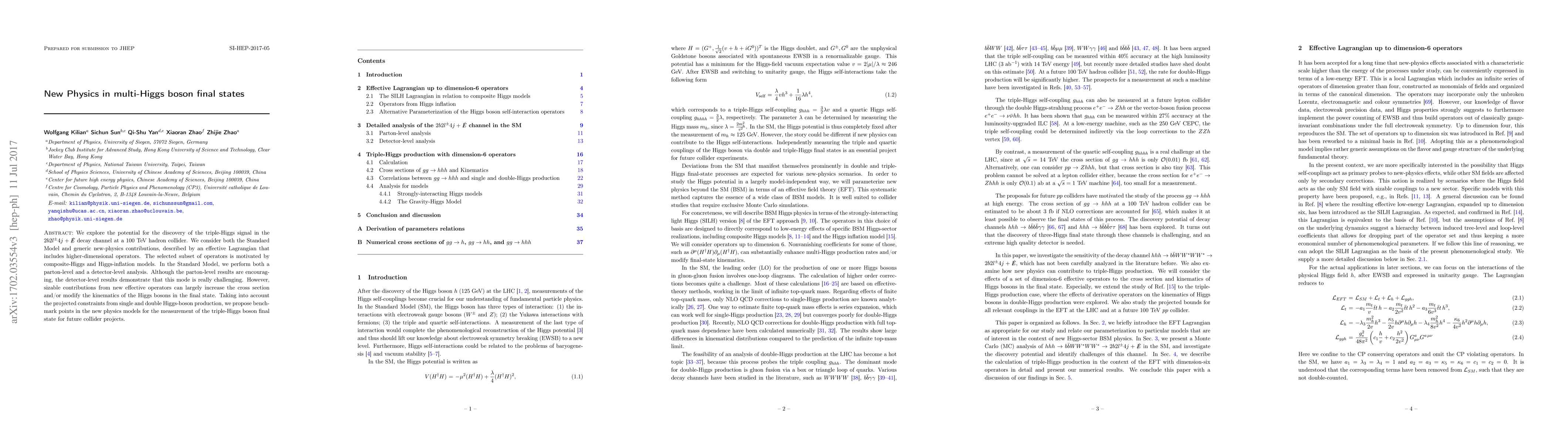 We explore the potential for the discovery of the triple-Higgs signal in the $2b2l^{\pm}4j+E\!\!\!/$ decay channel at a $100$ TeV hadron collider. We consider both the Standard Model and generic new-physics contributions, described by an effective Lagrangian that includes higher-dimensional operators. The selected subset of operators is motivated by composite-Higgs and Higgs-inflation models. In the Standard Model, we perform both a parton-level and a detector-level analysis. Although the parton-level results are encouraging, the detector-level results demonstrate that this mode will be really challenging. However, sizable contributions from new effective operators can largely increase the cross section and/or modify the kinematics of the Higgs bosons in the final state. Taking into account the projected constraints from single and double Higgs-boson production, we propose benchmark points in the new physics models for the measurement of the triple-Higgs boson final state for future collider projects.
