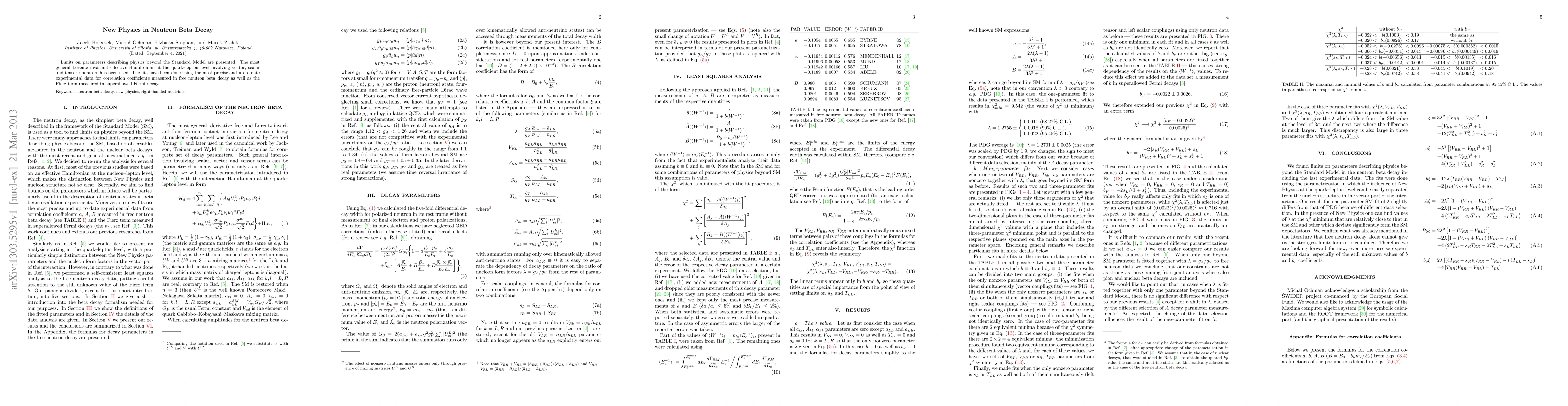 This paper presents limits on parameters for physics beyond the Standard Model using the most general Lorentz invariant effective Hamiltonian, focusing on vector, scalar, and tensor operators. It employs precise experimental data from neutron beta decay and superallowed Fermi decays to derive these limits.