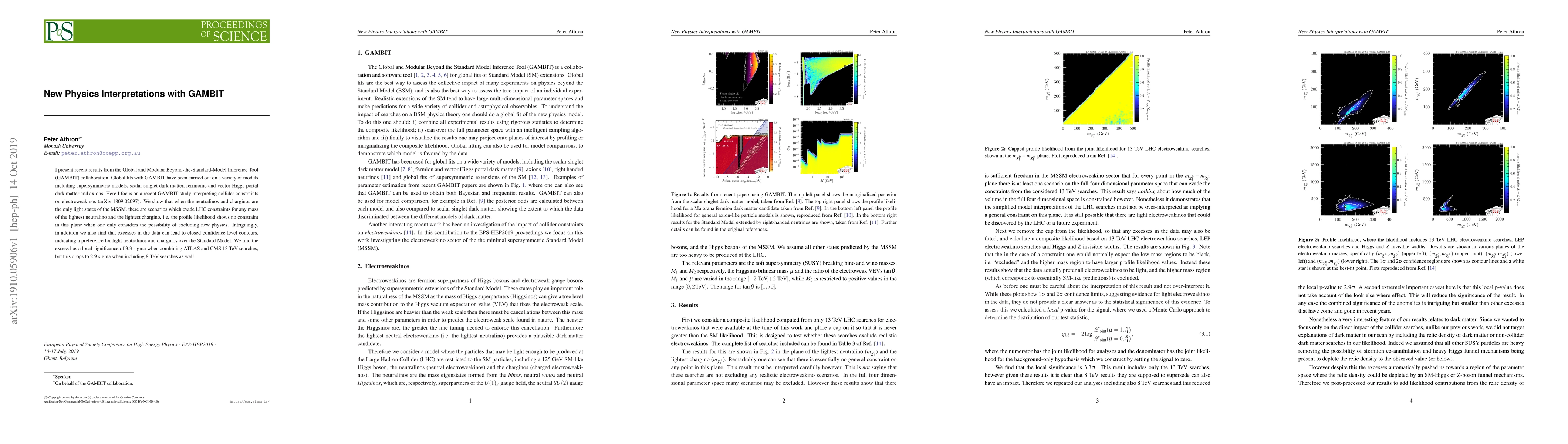 I present recent results from the Global and Modular Beyond-the-Standard-Model Inference Tool (GAMBIT) collaboration. Global fits with GAMBIT have been carried out on a variety of models including supersymmetric models, scalar singlet dark matter, fermionic and vector Higgs portal dark matter and axions. Here I focus on a recent GAMBIT study interpreting collider constraints on electroweakinos (arXiv:1809.02097). We show that when the neutralinos and charginos are the only light states of the MSSM, there are scenarios which evade LHC constraints for any mass of the lightest neutralino and the lightest chargino, i.e. the profile likelihood shows no constraint in this plane when one only considers the possibility of excluding new physics. Intriguingly, in addition we also find that excesses in the data can lead to closed confidence level contours, indicating a preference for light neutralinos and charginos over the Standard Model. We find the excess has a local significance of 3.3 sigma when combining ATLAS and CMS 13 TeV searches, but this drops to 2.9 sigma when including 8 TeV searches as well.