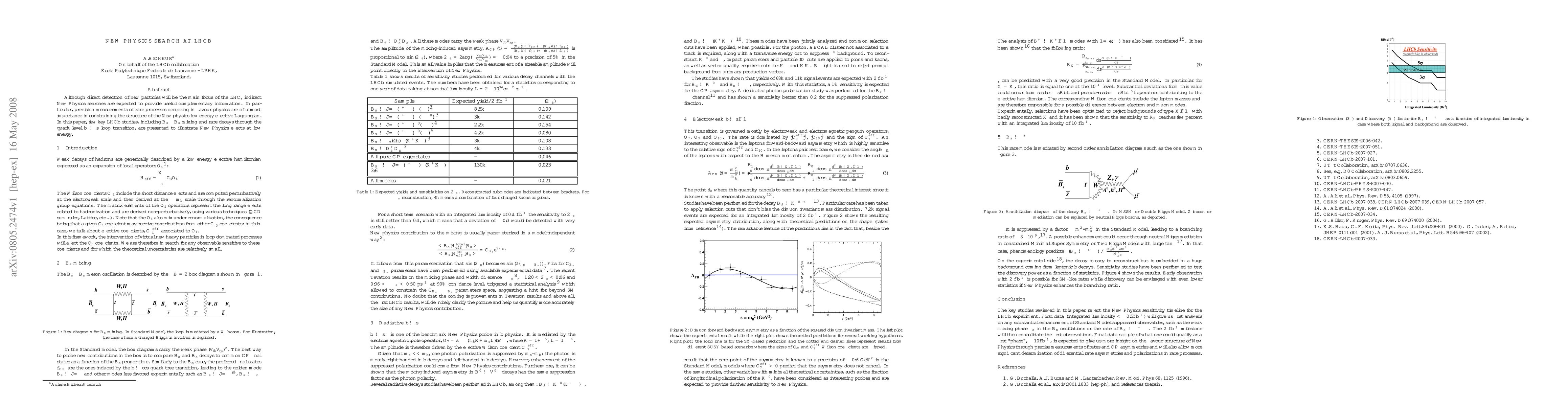 Although direct detection of new particles will be the main focus of the LHC, indirect New Physics searches are expected to provide useful complementary information. In particular, precision measurements of rare processes occurring in flavour physics are of utmost importance in constraining the structure of the New physics low energy effective Lagrangian. In this paper, few key LHCb studies, including $B_s-\bar{B}_s$ mixing and rare decays through the quark level $b\to s$ loop transition, are presented to illustrate New Physics effects at low energy.
