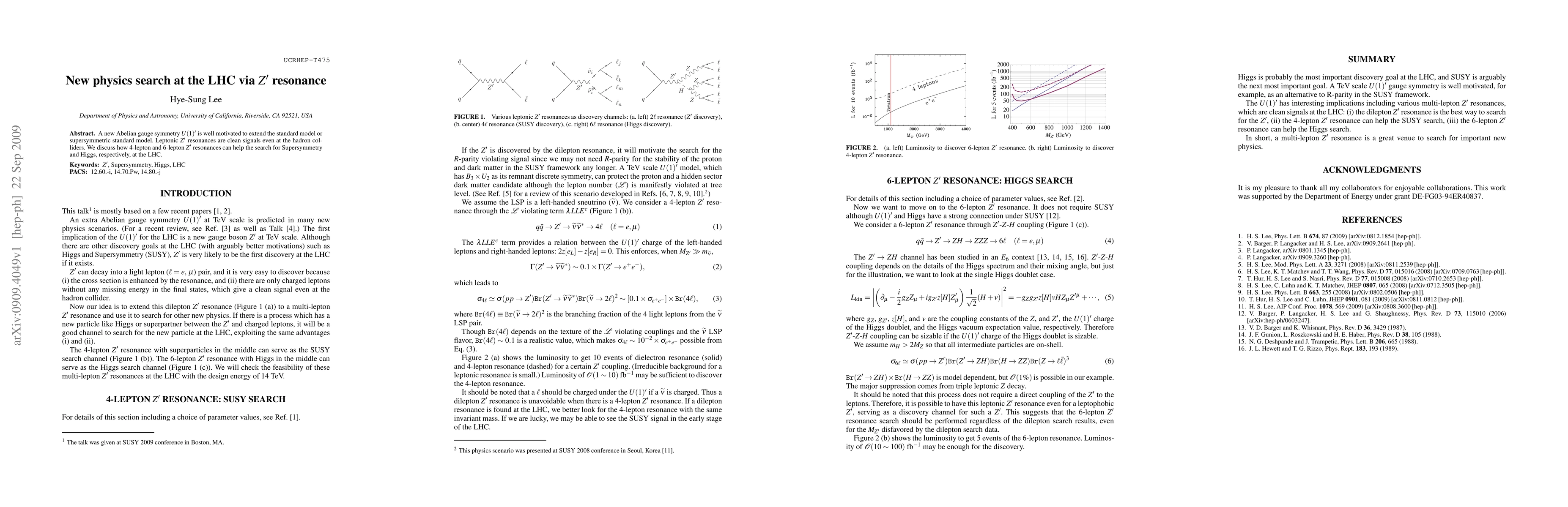 A new Abelian gauge symmetry U(1)' is well motivated to extend the standard model or supersymmetric standard model. Leptonic Z' resonances are clean signals even at the hadron colliders. We discuss how 4-lepton and 6-lepton Z' resonances can help the search for Supersymmetry and Higgs, respectively, at the LHC.