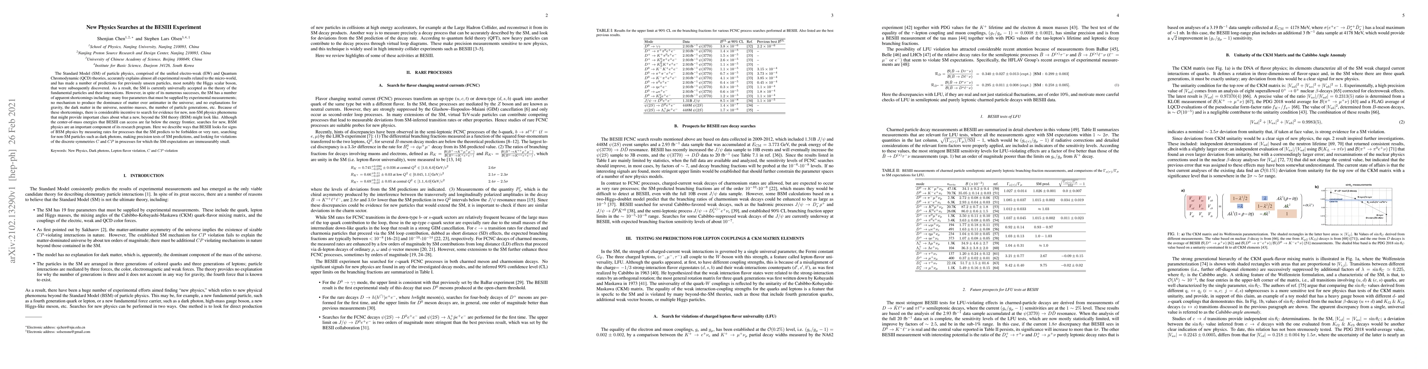 The Standard Model (SM) of particle physics, comprised of the unified electro-weak (EW) and Quantum Chromodynamic (QCD) theories, accurately explains almost all experimental results related to the micro-world, and has made a number of predictions for previously unseen particles, most notably the Higgs scalar boson, that were subsequently discovered. As a result, the SM is currently universally accepted as the theory of the fundamental particles and their interactions. However, in spite of its numerous successes, the SM has a number of apparent shortcomings including: many free parameters that must be supplied by experimental measurements; no mechanism to produce the dominance of matter over antimatter in the universe; and no explanations for gravity, the dark matter in the universe, neutrino masses, the number of particle generations, etc. Because of these shortcomings, there is considerable incentive to search for evidence for new, non-SM physics phenomena that might provide important clues about what a new, beyond the SM theory (BSM) might look like. Although the center-of-mass energies that BESIII can access are far below the energy frontier, searches for new, BSM physics are an important component of its research program. Here we describe ways that BESIII looks for signs of BSM physics by measuring rates for processes that the SM predicts to be forbidden or very rare, searching for non-SM particles such as dark photons, making precision tests of SM predictions, and looking for violations of the discrete symmetries $C$ and $CP$ in processes for which the SM-expectations are immeasurably small.
