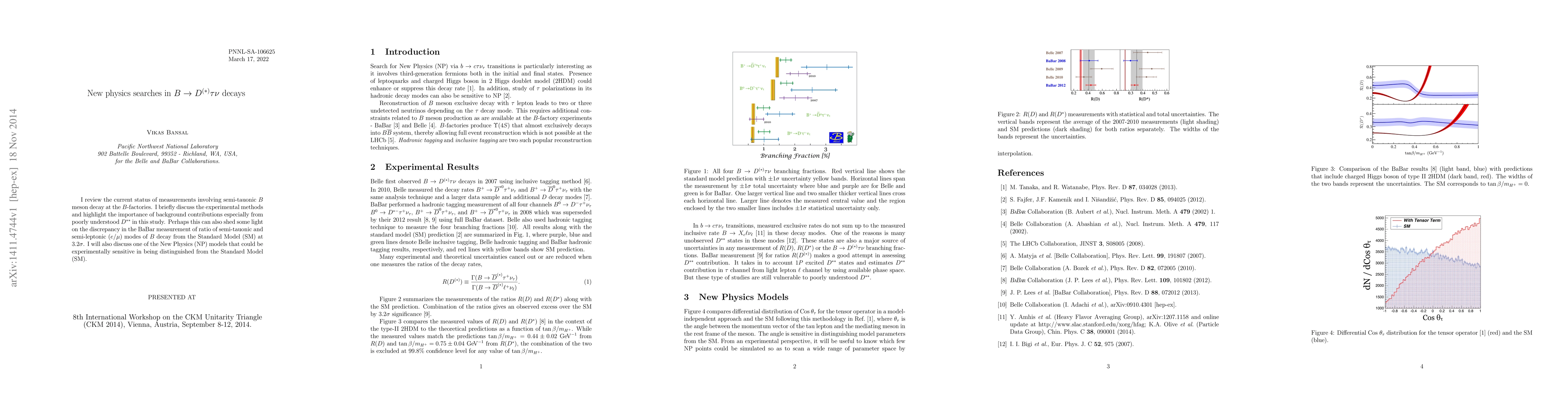 I review the current status of measurements involving semi-tauonic $B$ meson decay at the $B$-factories. I briefly discuss the experimental methods and highlight the importance of background contributions especially from poorly understood $D^{**}$ in this study. Perhaps this can also shed some light on the discrepancy in the BaBar measurement of ratio of semi-tauonic and semi-leptonic ($e$/$\mu$) modes of $B$ decay from the Standard Model (SM) at 3.2$\sigma$. I will also discuss one of the New Physics (NP) models that could be experimentally sensitive in being distinguished from the Standard Model (SM).