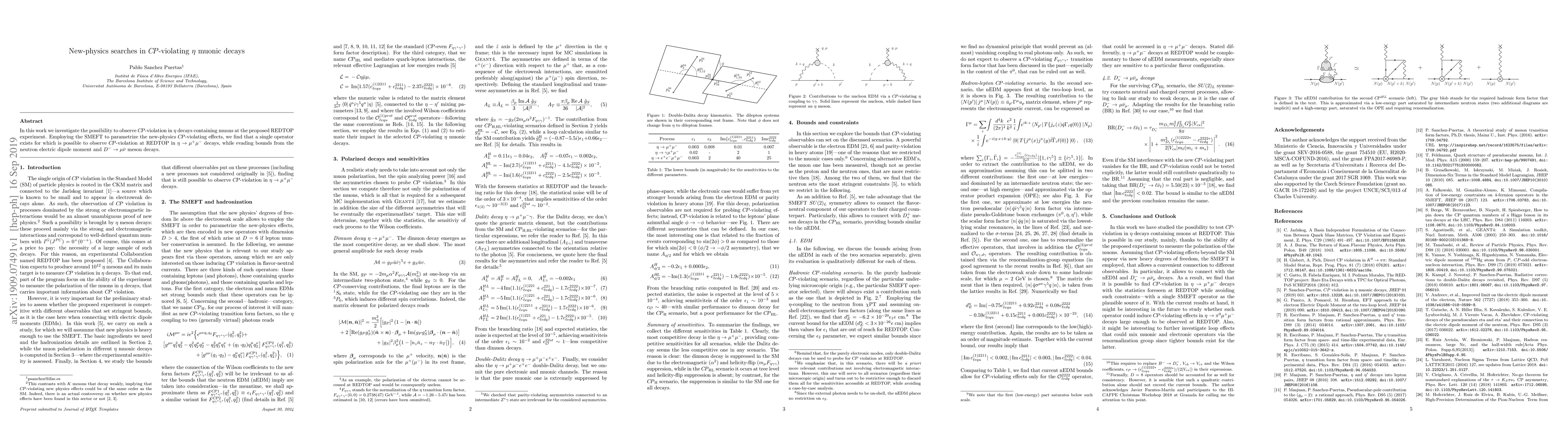 In this work we investigate the possibility to observe $C\!P$-violation in $\eta$ decays containing muons at the proposed REDTOP experiment. Employing the SMEFT to parametrize the new-physics $C\!P$-violating effects, we find that a single operator exists for which is possible to observe $C\!P$-violation at REDTOP in $\eta\to\mu^+\mu^-$ decays, while evading bounds from the neutron electric dipole moment and $D^-\to\mu\bar{\nu}$