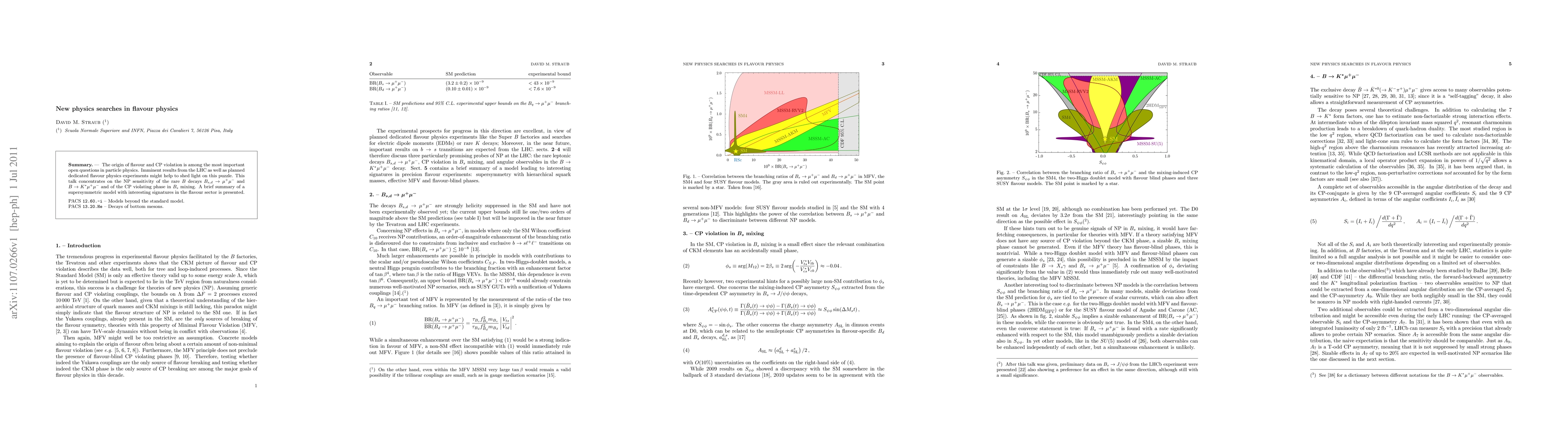 This paper explores new physics searches in flavour physics, focusing on the rare B decays B(s,d) -> mu+ mu- and B -> K* mu+ mu-, as well as the CP violating phase in B(s) mixing, to potentially uncover the origin of flavour and CP violation. It also briefly outlines a supersymmetric model with notable flavour sector signatures.