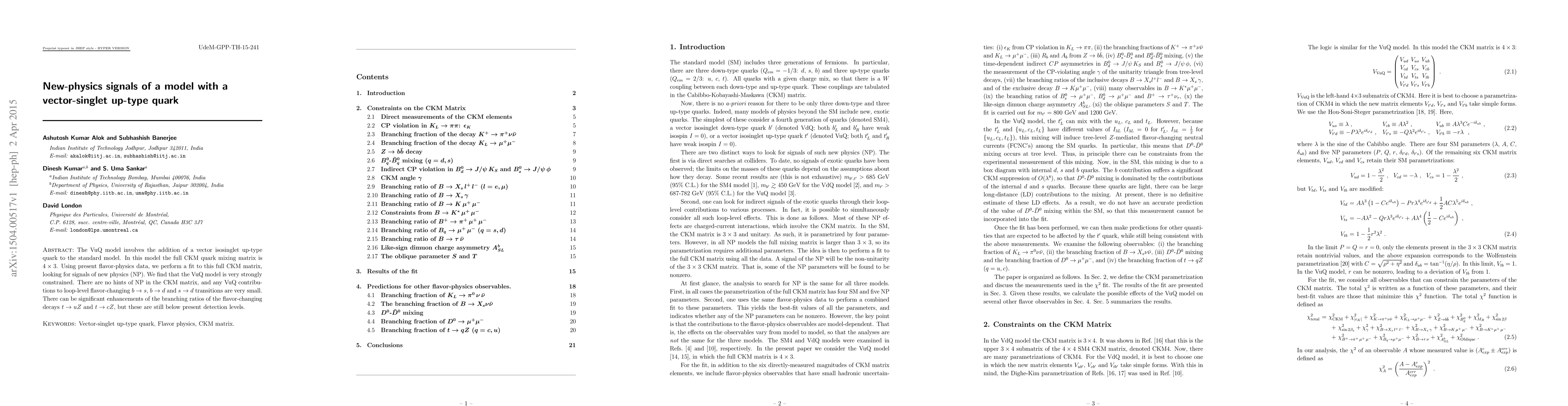 The VuQ model involves the addition of a vector isosinglet up-type quark to the standard model. In this model the full CKM quark mixing matrix is 4 X 3. Using present flavor-physics data, we perform a fit to this full CKM matrix, looking for signals of new physics (NP). We find that the VuQ model is very strongly constrained. There are no hints of NP in the CKM matrix, and any VuQ contributions to loop-level flavor-changing b -> s, b -> d and s -> d transitions are very small. There can be significant enhancements of the branching ratios of the flavor-changing decays t -> u Z and t -> c Z, but these are still below present detection levels.