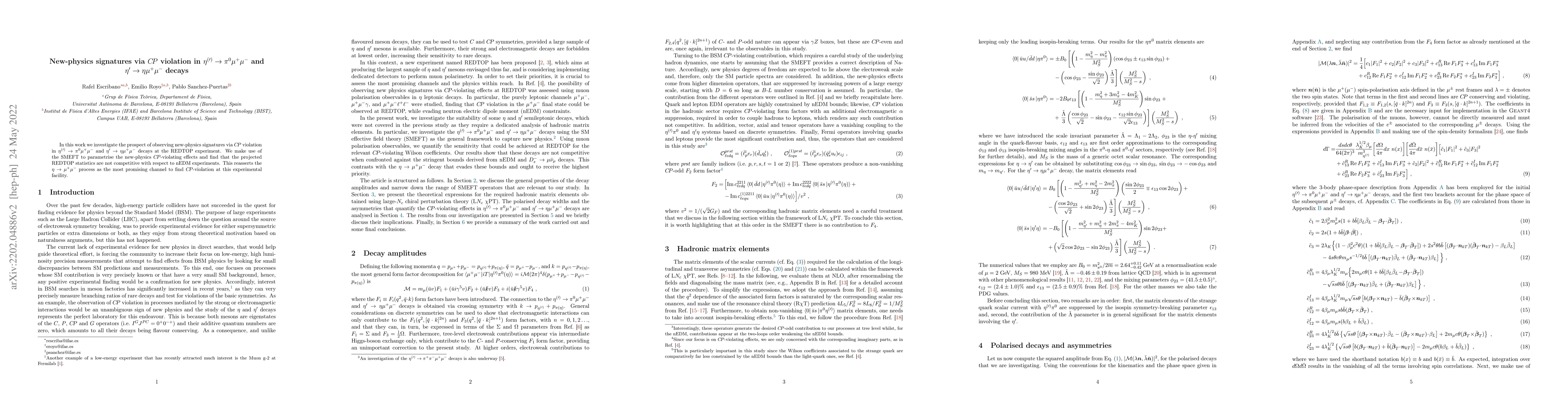 In this work we investigate the prospect of observing new-physics signatures via $C\!P$ violation in $\eta^{(\prime)}\to\pi^0\mu^+\mu^-$ and $\eta^\prime\to\eta\mu^+\mu^-$ decays at the REDTOP experiment. We make use of the SMEFT to parametrise the new-physics $C\!P$-violating effects and find that the projected REDTOP statistics are not competitive with respect to nEDM experiments. This reasserts the $\eta\to\mu^+\mu^-$ process as the most promising channel to find $C\!P$-violation at this experimental facility.