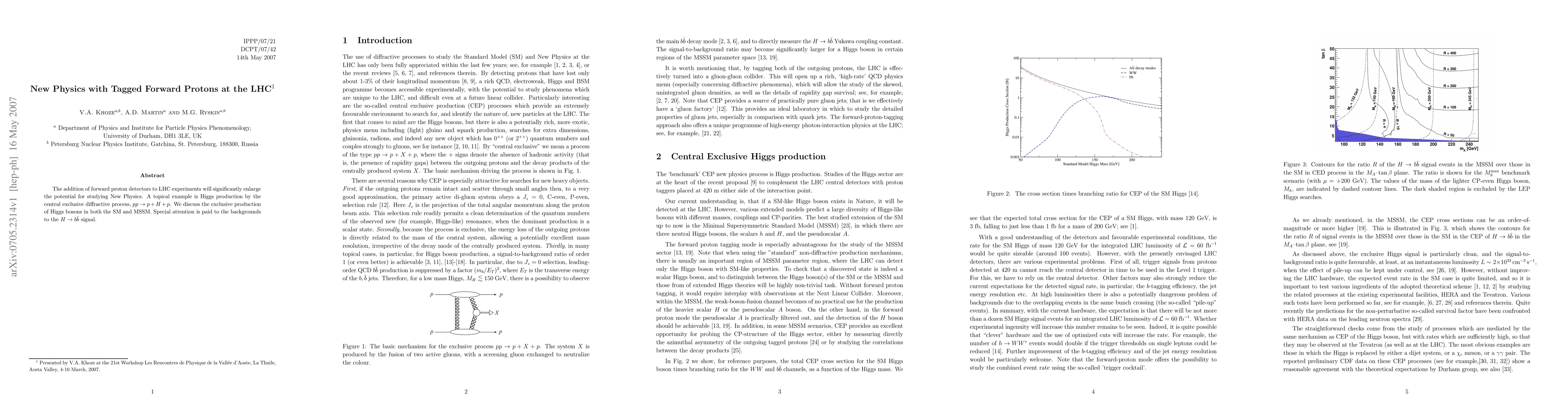 This paper explores how forward proton detectors at the LHC can enhance the study of New Physics, particularly focusing on Higgs production via central exclusive diffractive processes. It examines both Standard Model and MSSM scenarios, with detailed analysis of backgrounds affecting the H -> bbbar signal.
