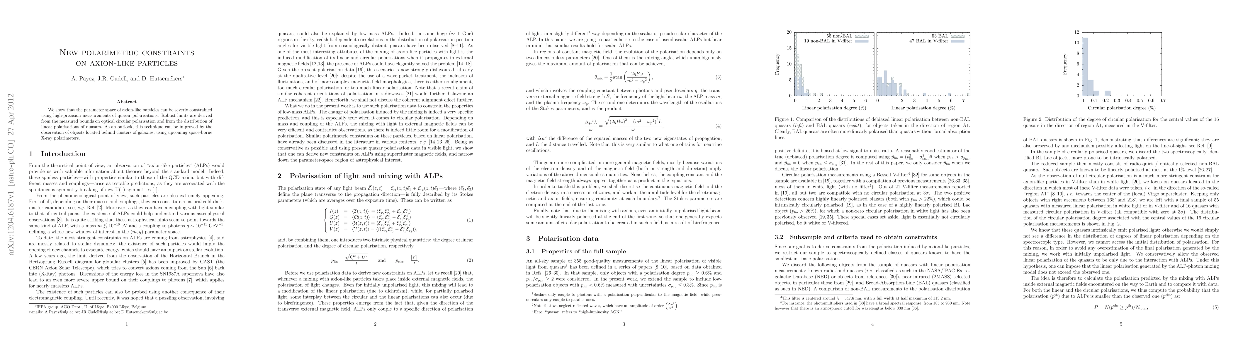 We show that the parameter space of axion-like particles can be severly constrained using high-precision measurements of quasar polarisations. Robust limits are derived from the measured bounds on optical circular polarisation and from the distribution of linear polarisations of quasars. As an outlook, this technique can be improved by the observation of objects located behind clusters of galaxies, using upcoming space-borne X-ray polarimeters.