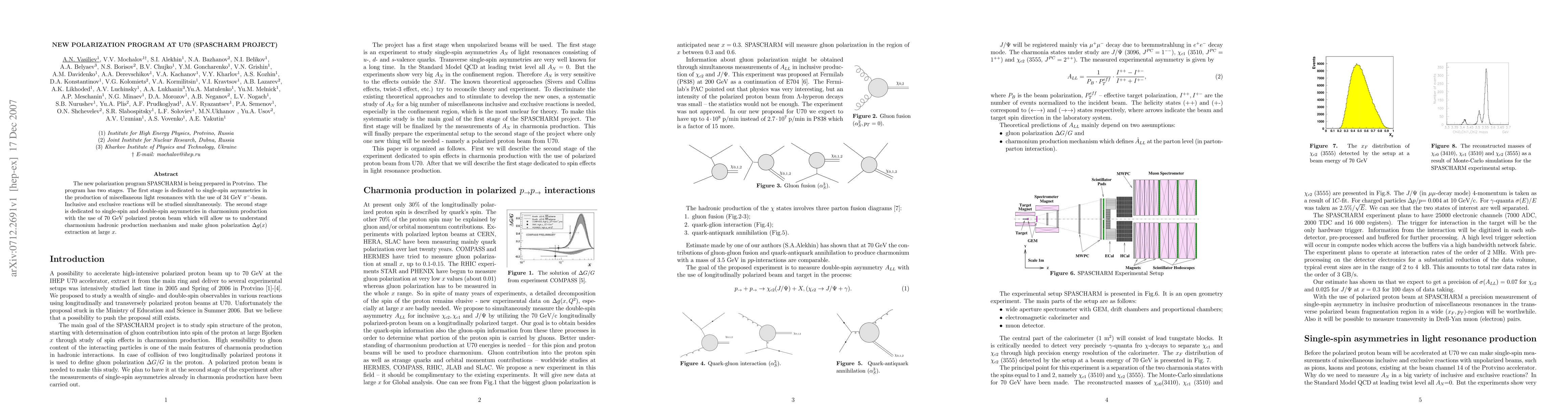 The new polarization program SPASCHARM is being prepared in Protvino. The program has two stages. The first stage is dedicated to single-spin asymmetries in the production of miscellaneous light resonances with the use of 34 GeV $\pi^-$-beam. Inclusive and exclusive reactions will be studied simultaneously. The second stage is dedicated to single-spin and double-spin asymmetries in charmonium production with the use of 70 GeV polarized proton beam which will allow us to understand charmonium hadronic production mechanism and make gluon polarization $\Delta g(x)$ extraction at large $x$.