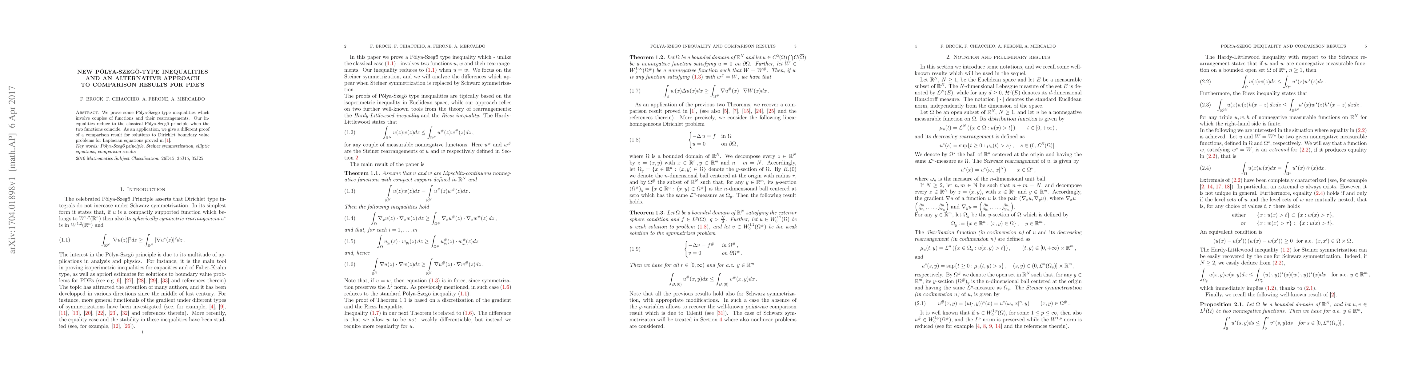 We prove some P\'olya-Szeg\"o type inequalities which involve couples of functions and their rearrangements. Our inequalities reduce to the classical P\'olya-Szeg\"o principle when the two functions coincide. As an application, we give a different proof of a comparison result for solutions to Dirichlet boundary value problems for Laplacian equations proved by A. Alvino, G. Trombetti, J. I. Diaz and P. L. Lions.