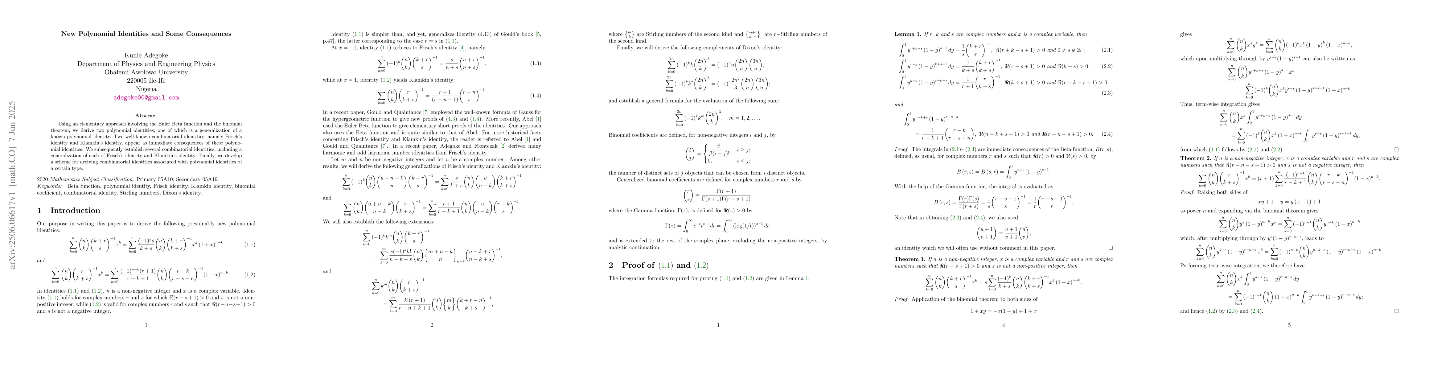 Researchers derive two polynomial identities using Euler Beta function and binomial theorem, leading to new combinatorial identities including generalizations of Frisch's and Klamkin's identities.